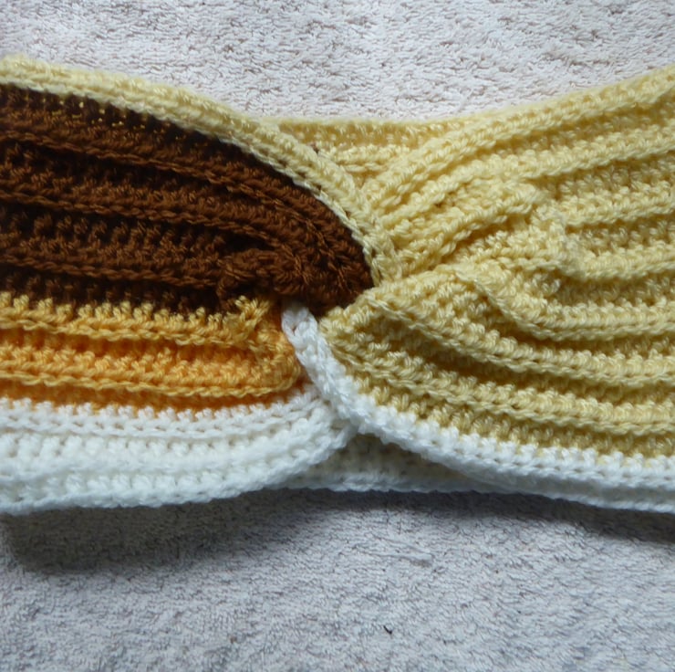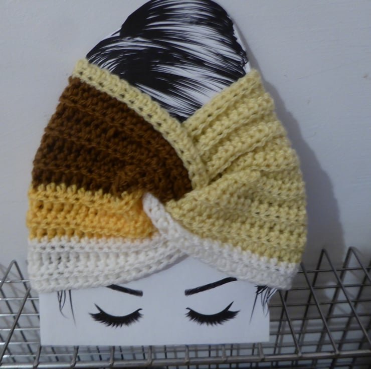 Cosy hand made twist front crotchet multi colour earwarmers to keep you nice and toasty for the winter