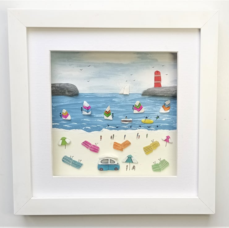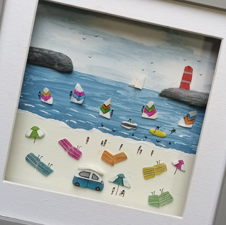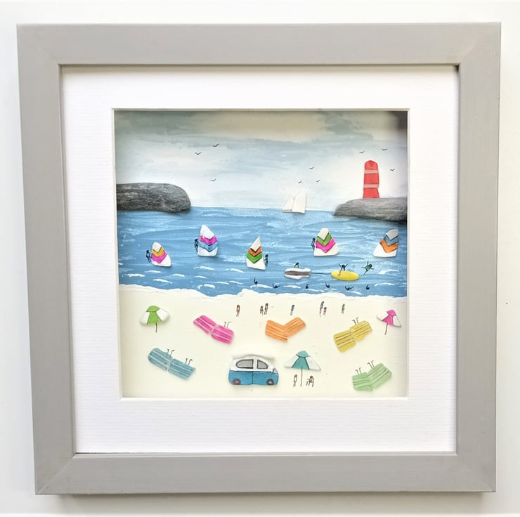A memory of a summer beach holiday holiday created with Cornish beachcombed finds set inside a 24cm square frame that is available in grey or white - an original gift idea for any time of the year