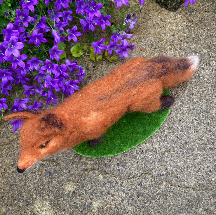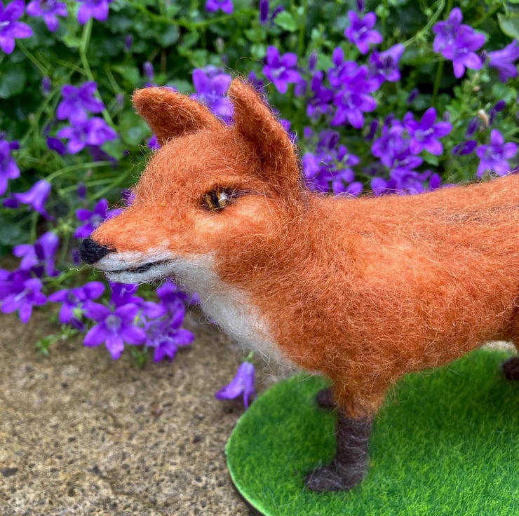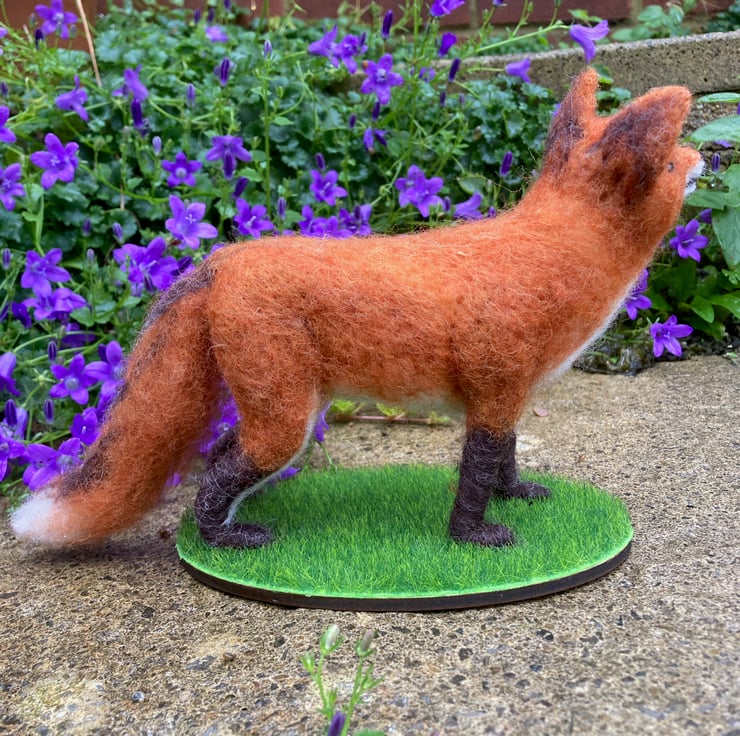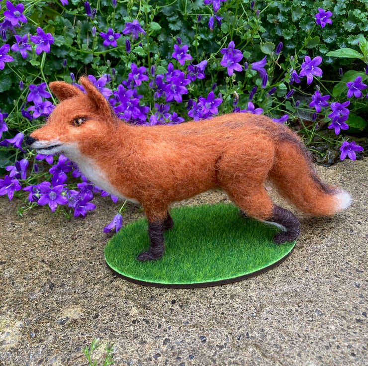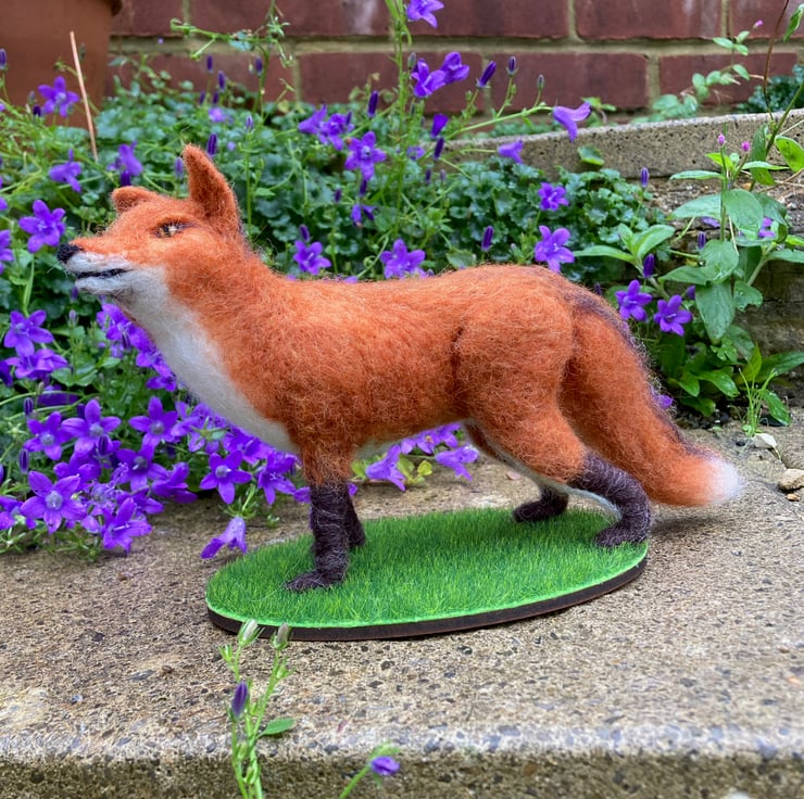 This inquisitive fox has been sculpted from woollen fibres. The basic shape has been formed using core wool shaped using a barbed felting needle and then a top coat in fox red colours has been added. Darker wool has been used on the legs and along the top of the tail, back and ears. The fox has been mounted on an oval shaped piece of plywood covered in artificial grass.