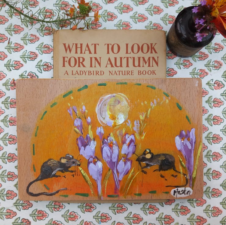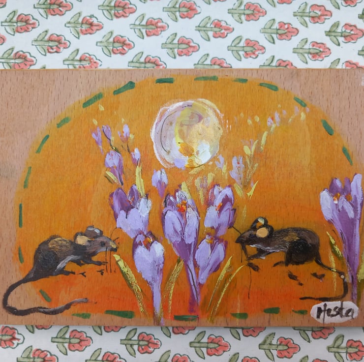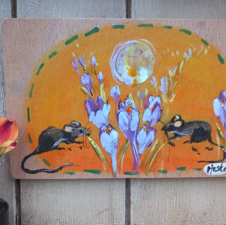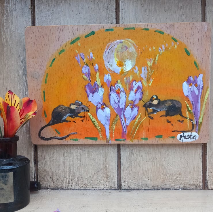 This is a sweet painting on reclaimed wood. Whimsical in nature. Clover and bod the mice met under the crocus moon. 18cm in length 12 cm wide. Lightly varnished and a hook on the back so ready to hang.