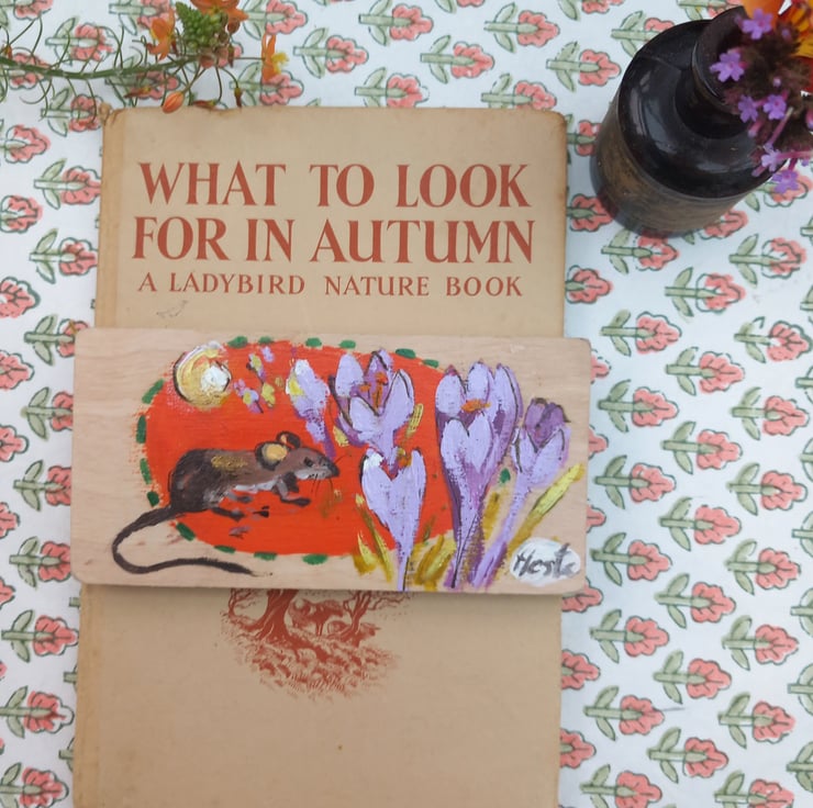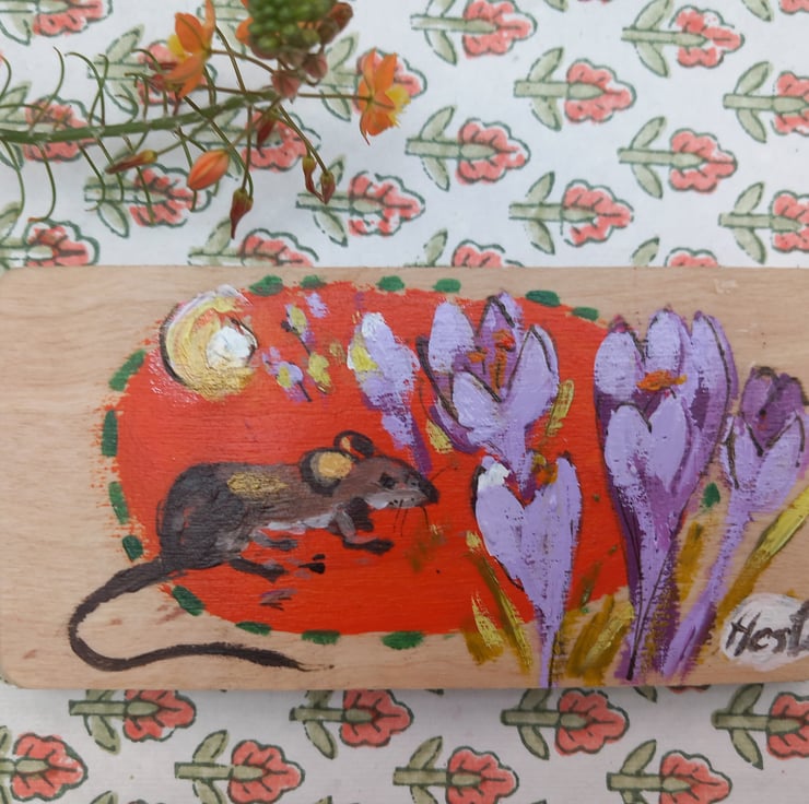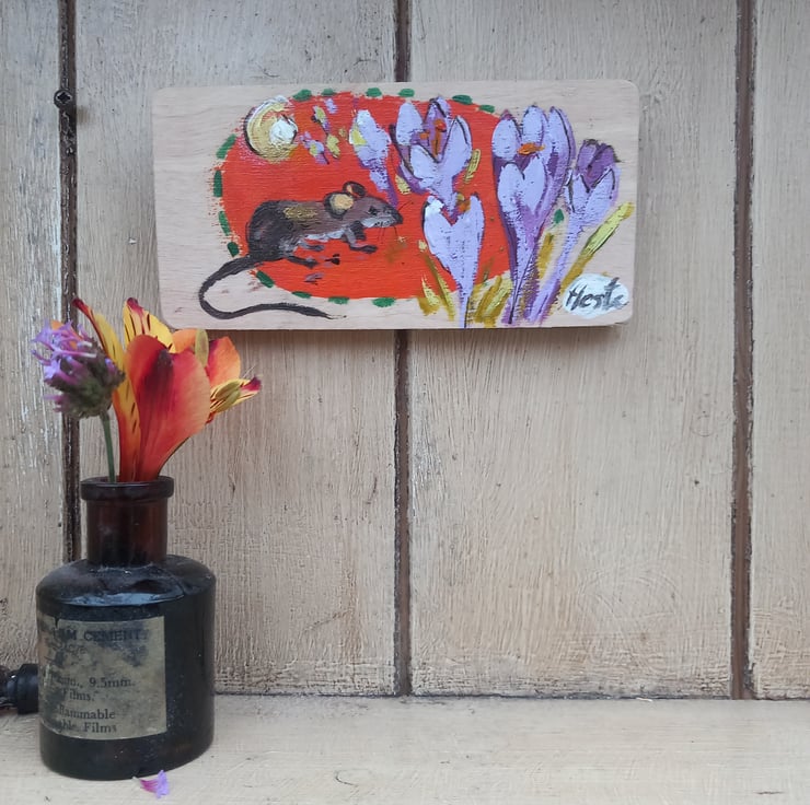 This is a small sweet painting on reclaimed wood. Whimsical in nature. Clover the mice investigating the crocus.111cm 6cm wide Lightly varnished with a hook on the back so ready to hang.