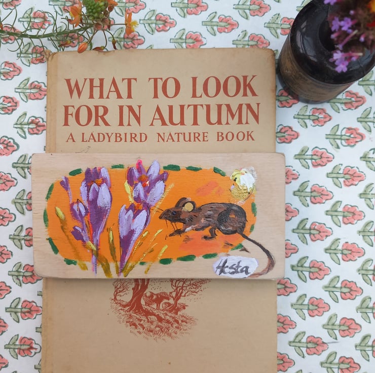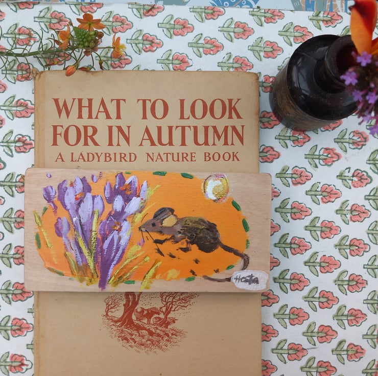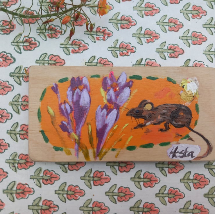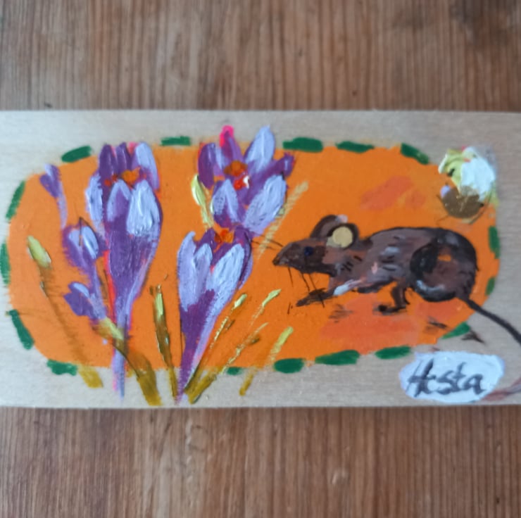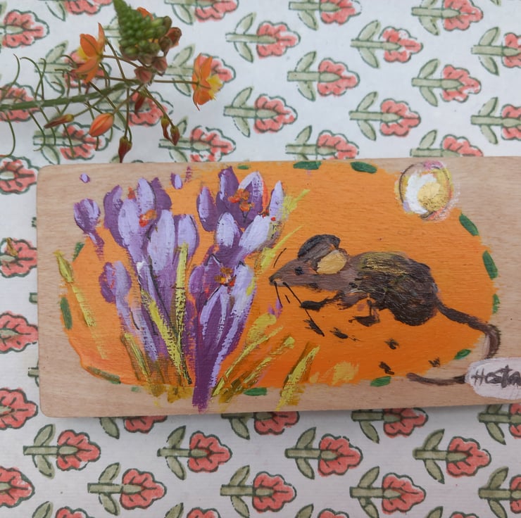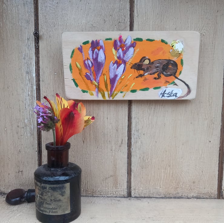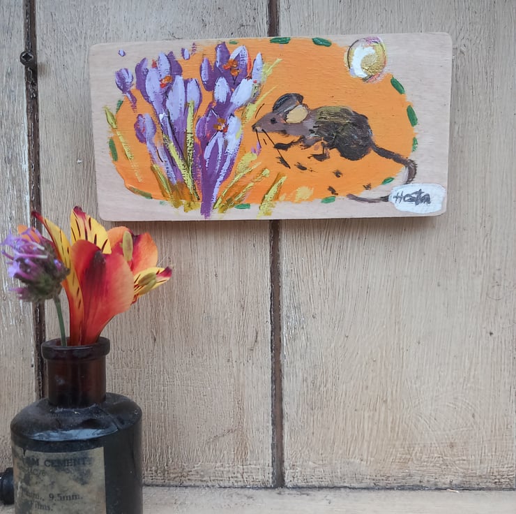 This is a small sweet painting on reclaimed wood. Whimsical in nature. Clover the mice investigating the crocus. 11cm long . 6cm wide Lightly varnished with a hook on the back so ready to hang.