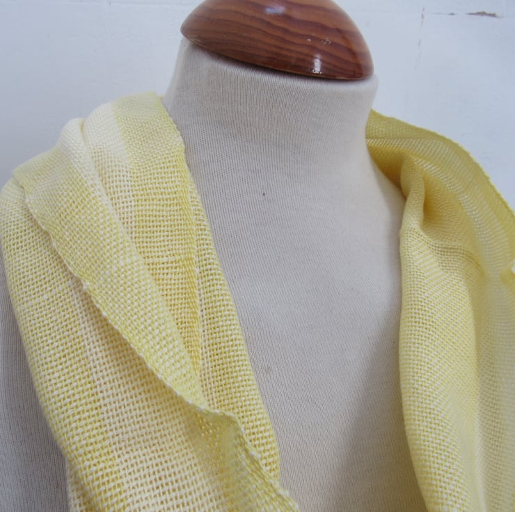 Hand woven from salvaged fine crochet cottons, this lightweight scarf is woven from fine yellow and cream threads, giving a soft fabric that drapes well