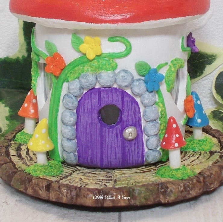 It is decorated with lots of detailing including clay flowers, vines, leaves, and rainbow toadstools. I have painted it using acrylic paints and it is glazed with two coats of varnish to protect it.