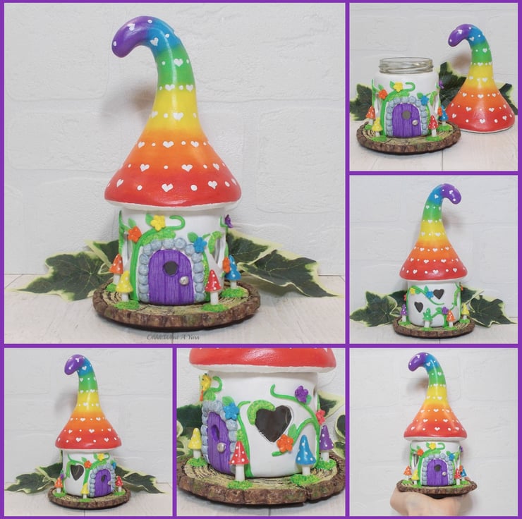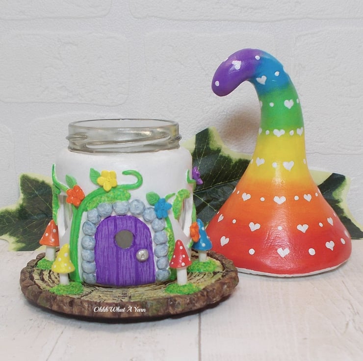 This cute rainbow fairy house sculpture/tealight is made using airdry clay and a glass screw top jar.