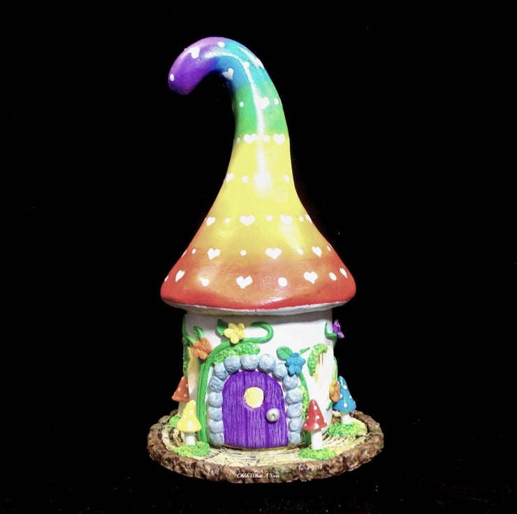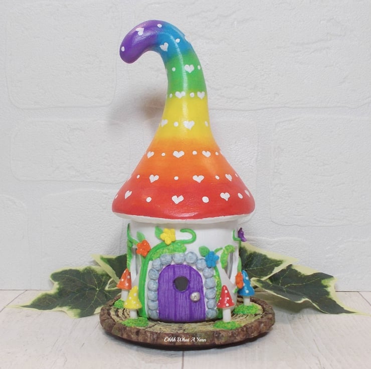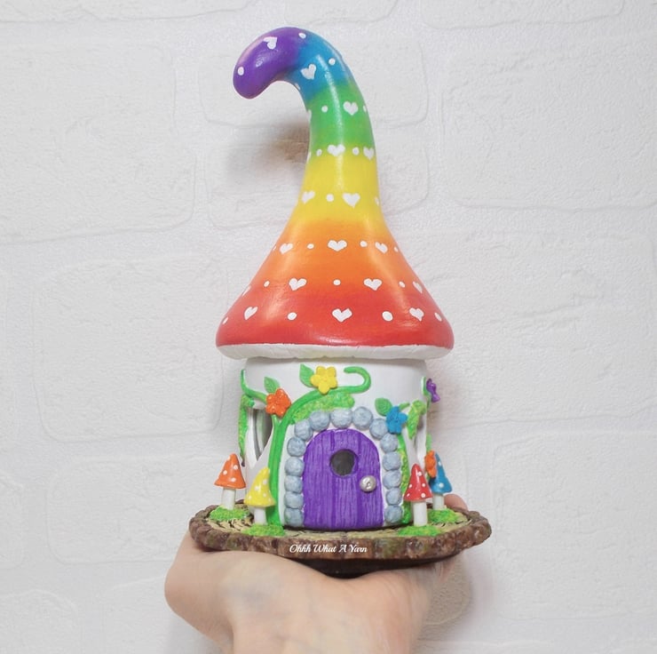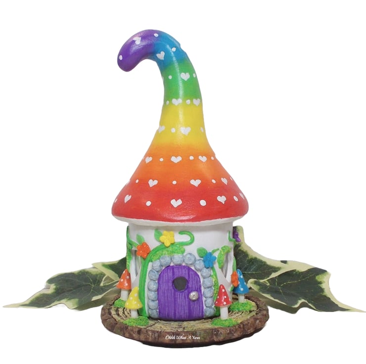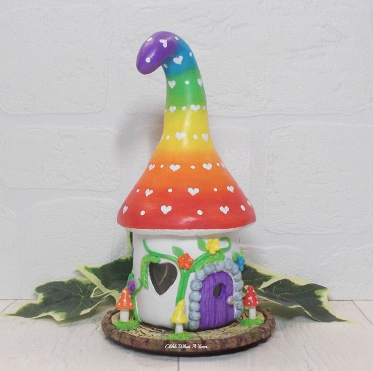 The rainbow toadstool top is painted with an ombre rainbow effect with little white painted love hearts.
