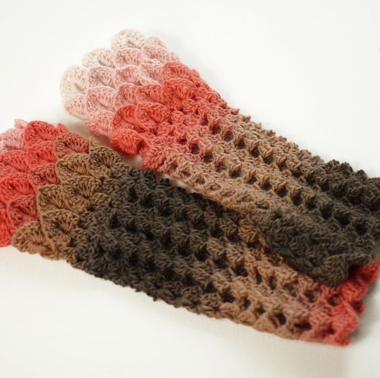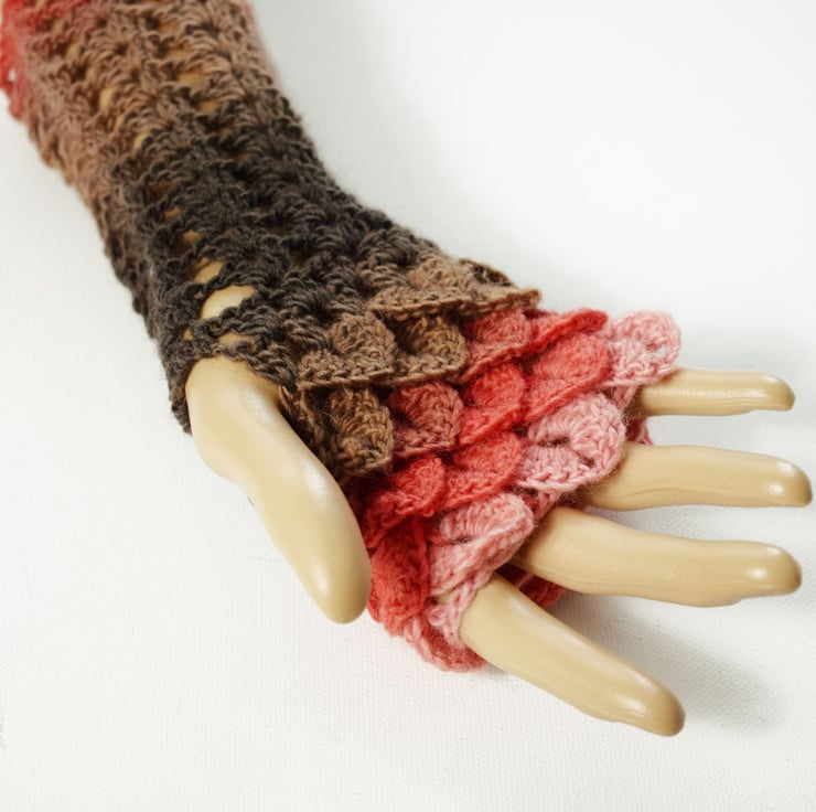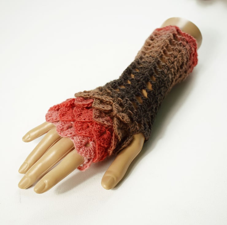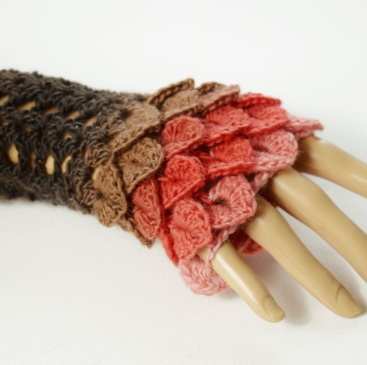 The tops are finished with dragonscale stitch whic also gives extra thickness to the hand section, the wrists are a lacier open stitch and have a nice amount of stretch so these gloves should fit up to a 7.5-8 inch wrist.