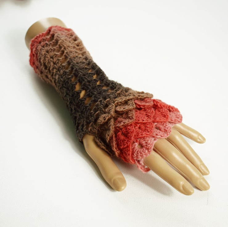 I have crocheted these gloves in a 75% wool, 25% nylon sock yarn so they are light but still warm and such an elegant and feminine design too.
