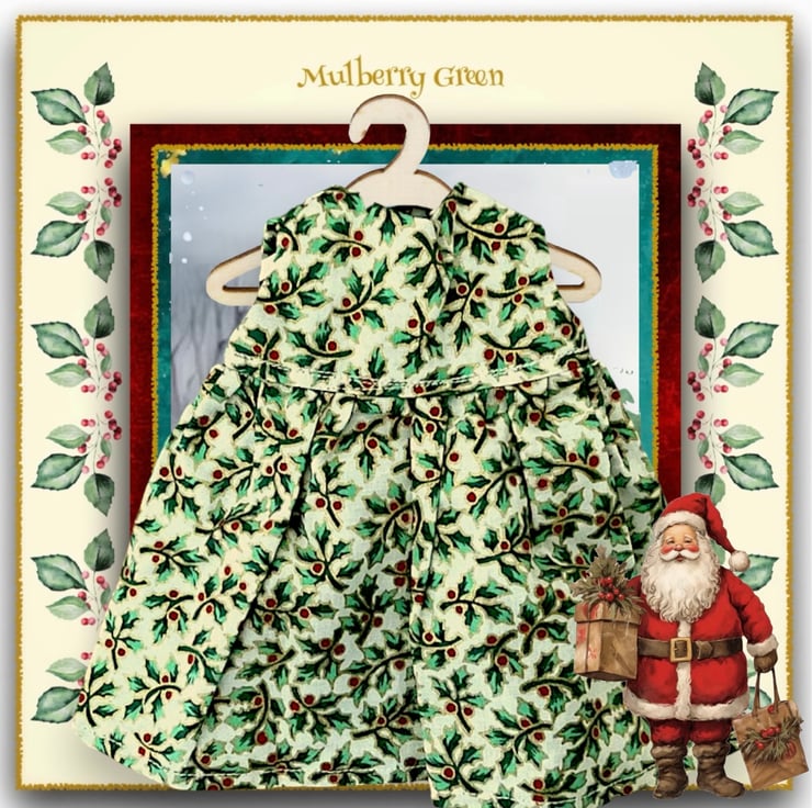 A cute little dress in a holly print, to fit the Mulberry Green dolls. The dress is handmade from best quality cotton, has a lined bodice and fastens at the back with a little popper