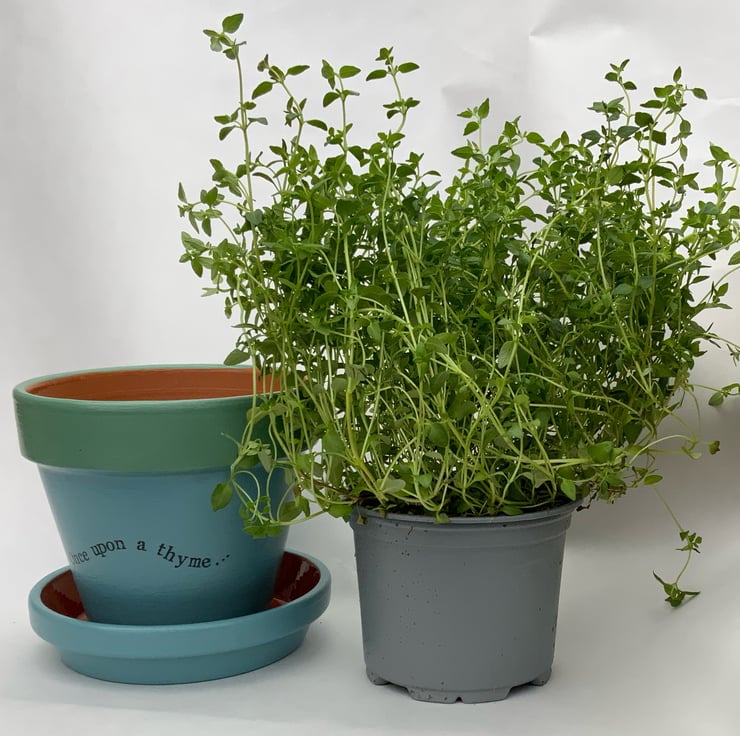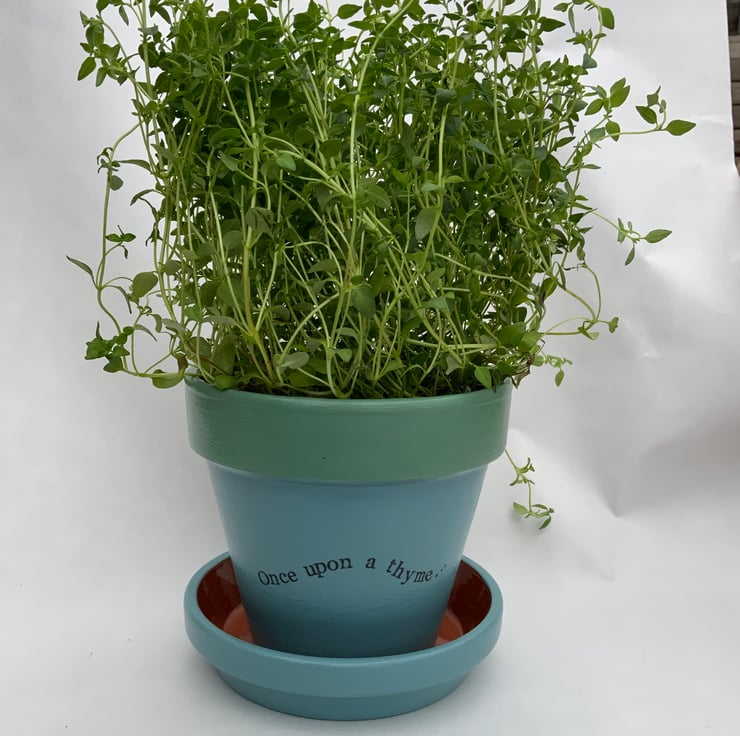 This minimalistic “Once upon a Thyme” pot, with matching saucer included, can be purchased as a one off or as part of a set of three. This was one of my first designs and I loved it so much that I have a set of three on my own kitchen window sill!