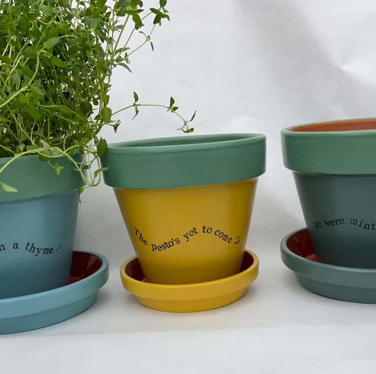 This was one of my first pot designs, much needed for the herbs on my kitchen window sill! I fell in love with the colour combinations and had to share this love by creating more sets to sell!