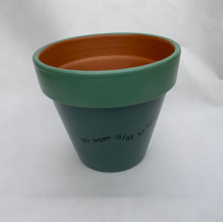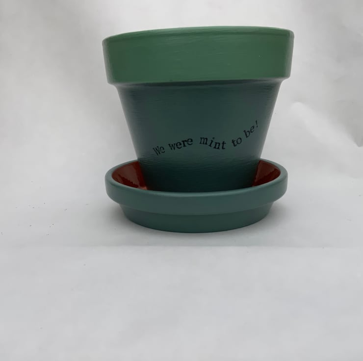 This minimalistic “We were mint to be” pot, with matching saucer included, can be purchased as a one off or as part of a set of three. This was one of my first designs and I loved it so much that I have a set of three on my own kitchen window sill!
