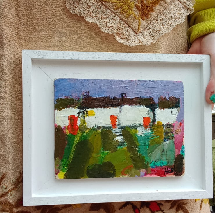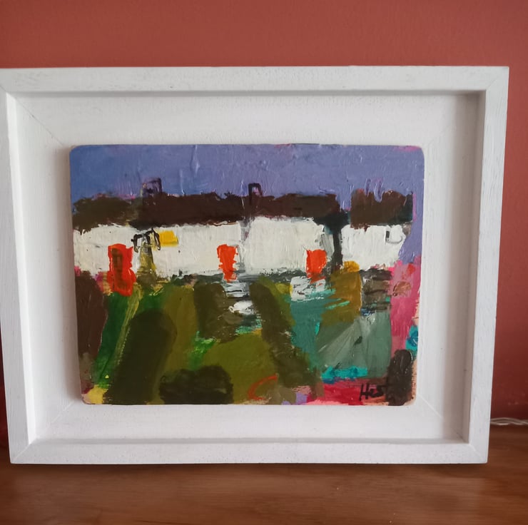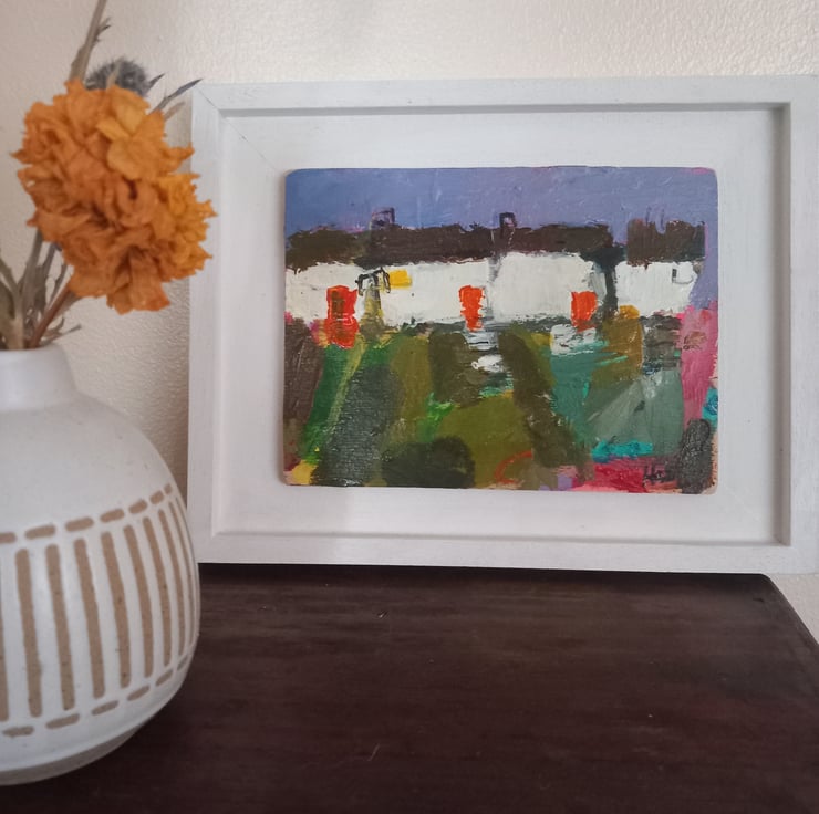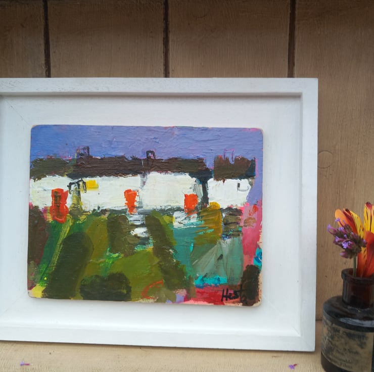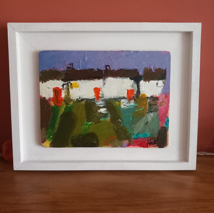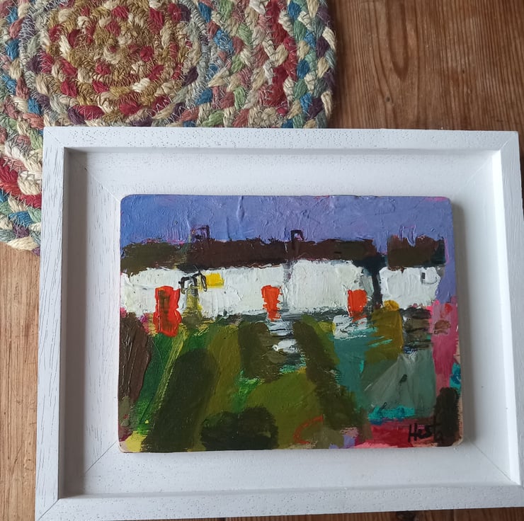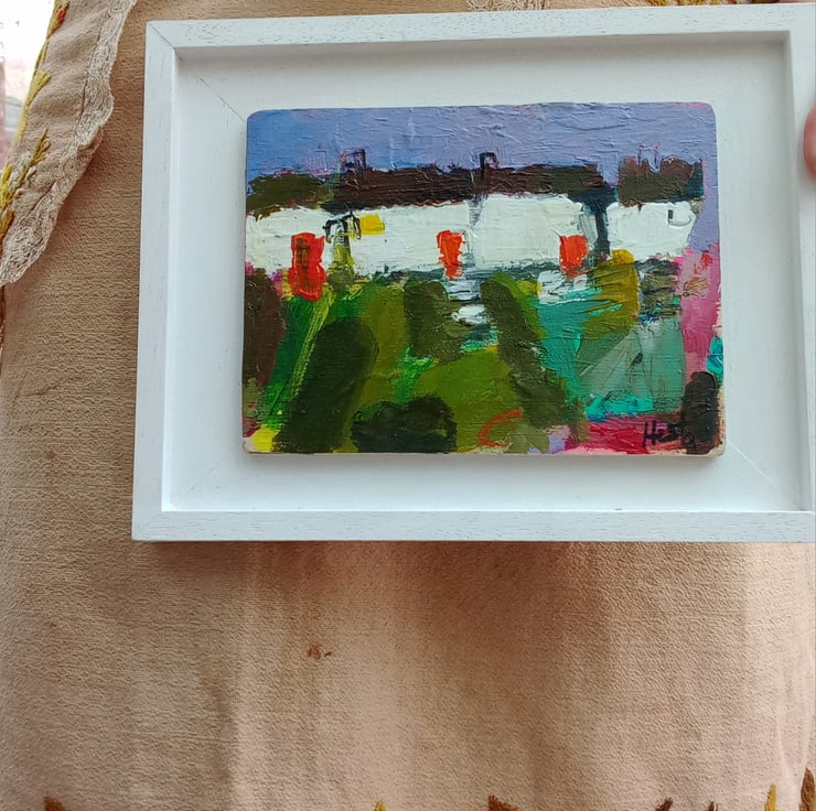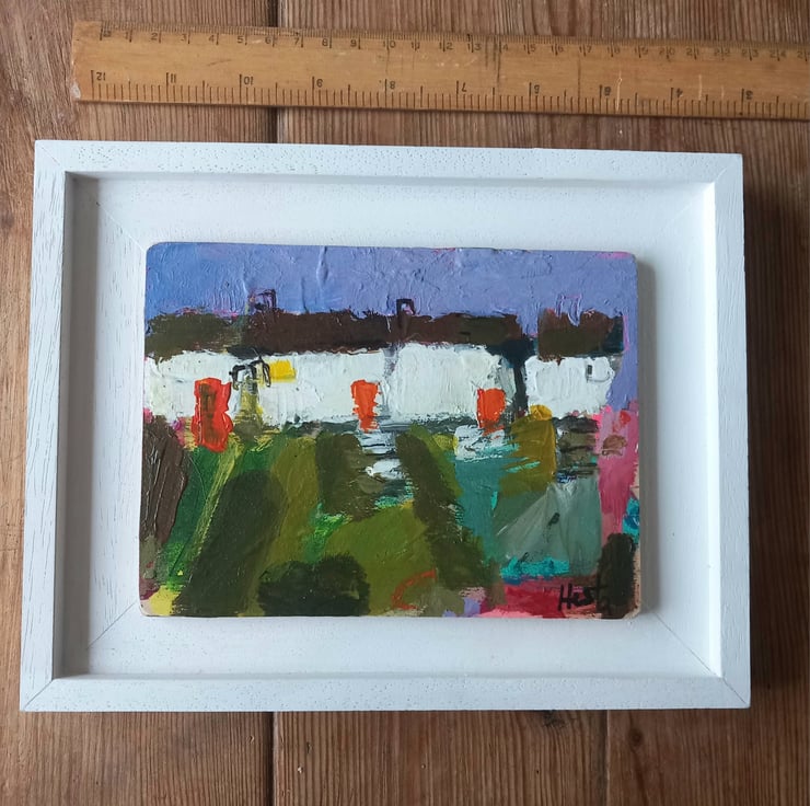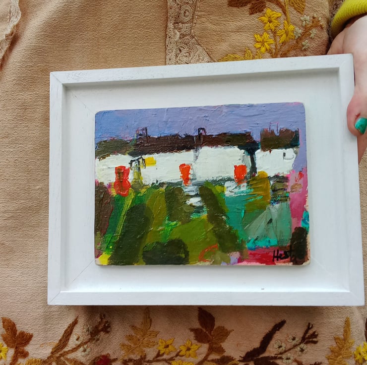 A contemporary, confident painting. Rich in texture and full or devon /cornish charm. A reminder of cottages passed. Painting on wood and framed on a bespoke handmade frames. 23cm long and 17cm wide inc frame.