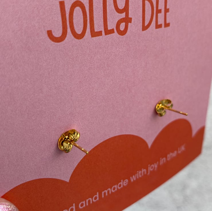Hypoallergenic gold coloured stainless steel post backs for sensitive ears.