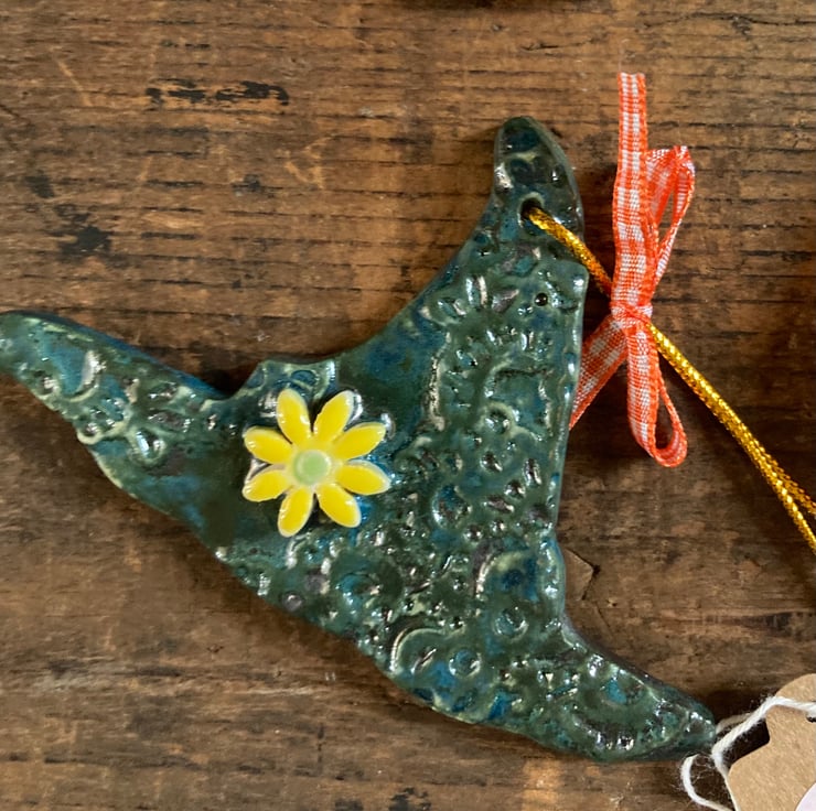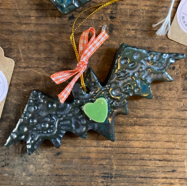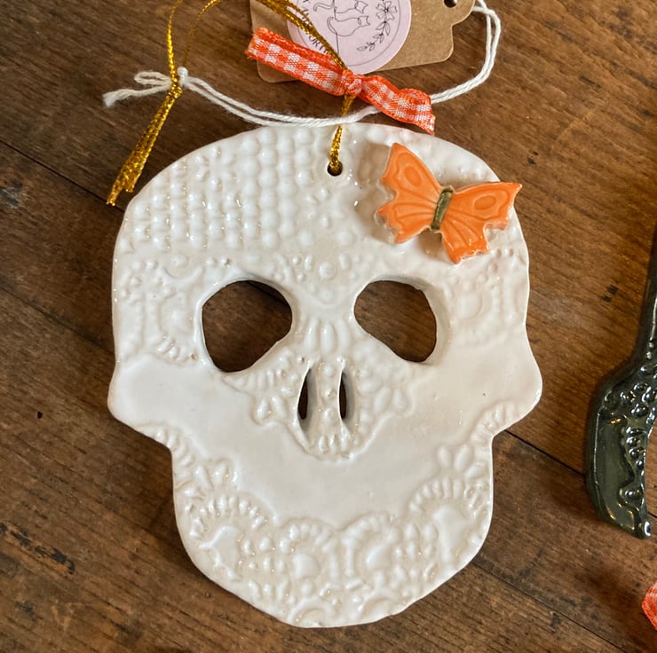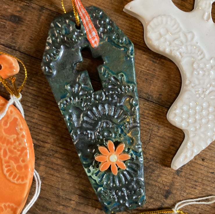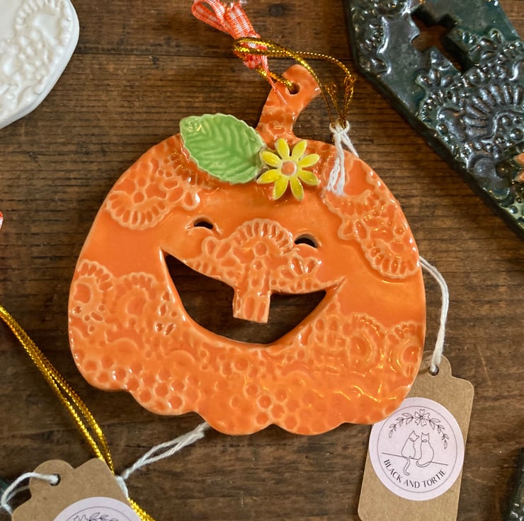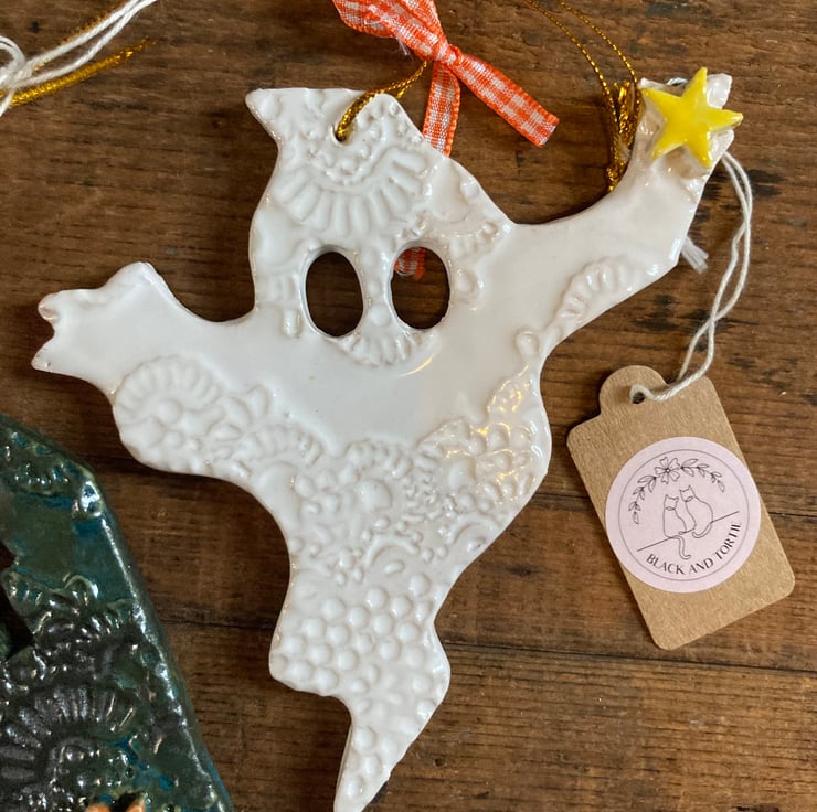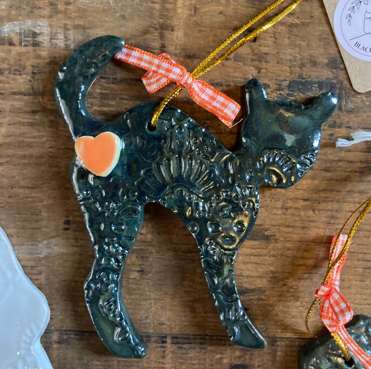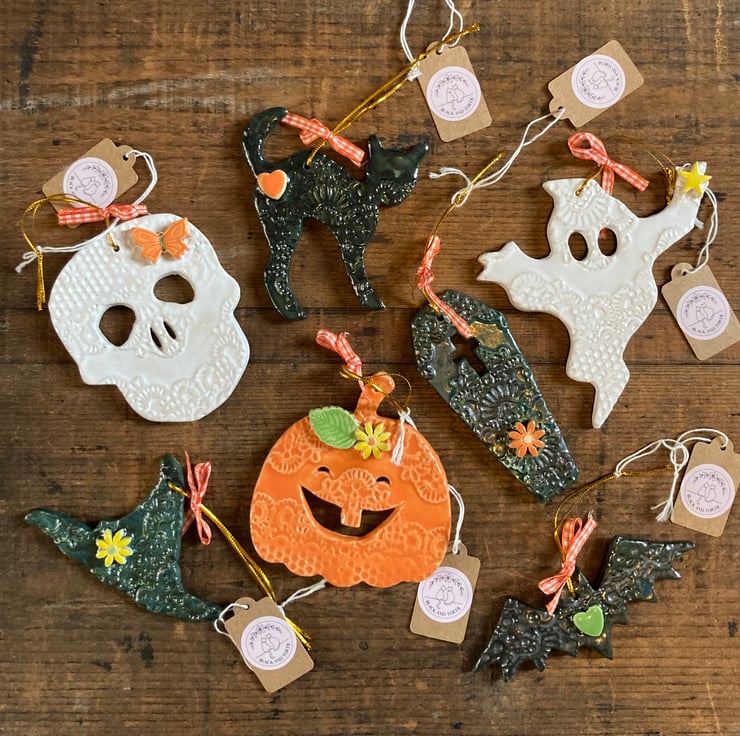Set of 7 kiln fired ceramic decorations for Halloween. Set includes pumpkin, skull, ghost, witch’s hat, bat, coffin and cat. Longest dimensions approx 10cm.