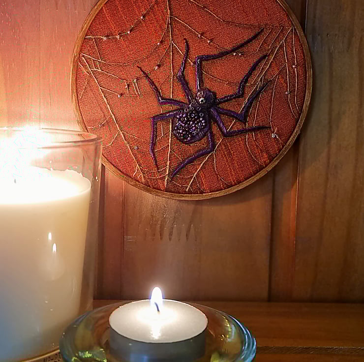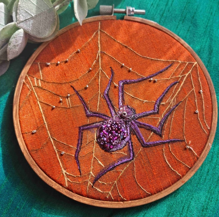 Spider and web hand painted and embroidered in pure silk threads onto Silk dupion fabric.