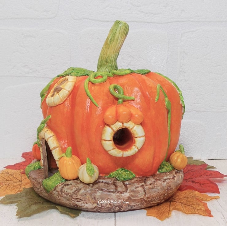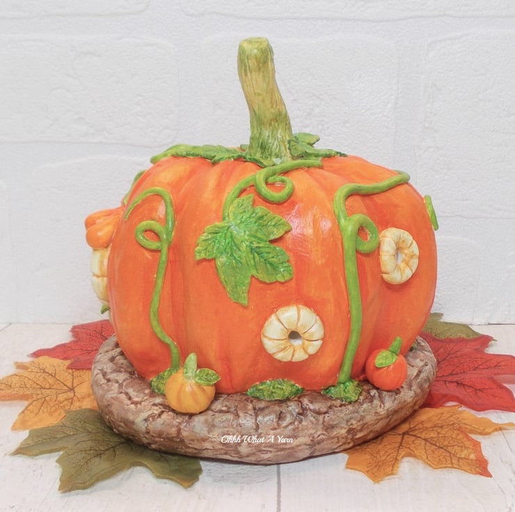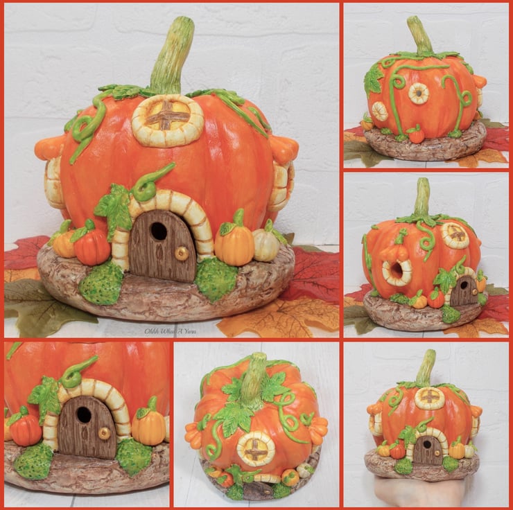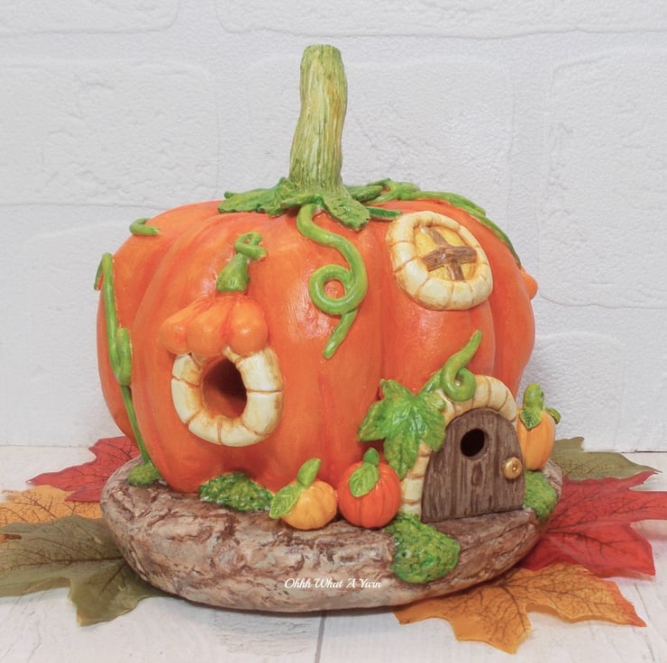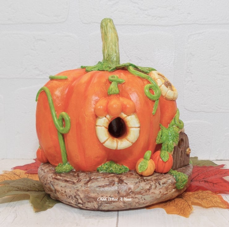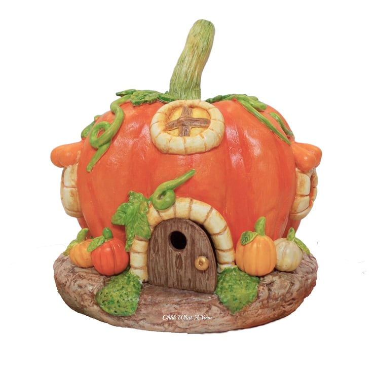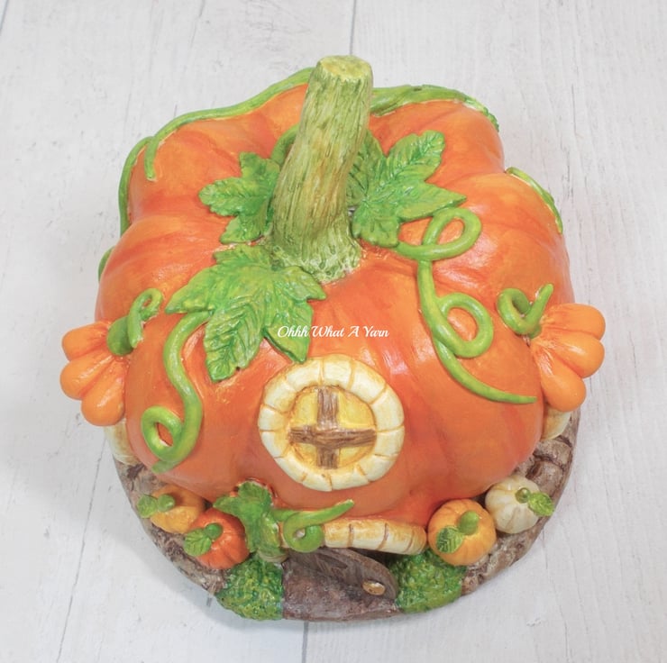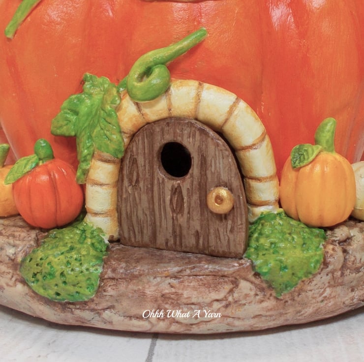 Pumpkin Cottage has a slightly ajar front door and lots of decorative vines and leaves. It has round windows and teeny pumpkins around the stone effect base.