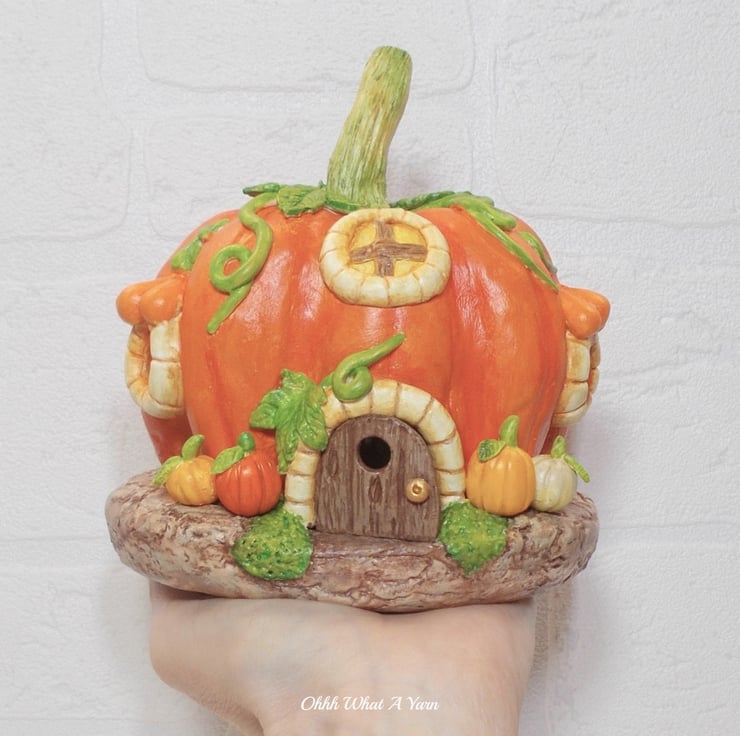 This cute little pumpkin fairy house has been created using air dry clay and a screw top glass jar.