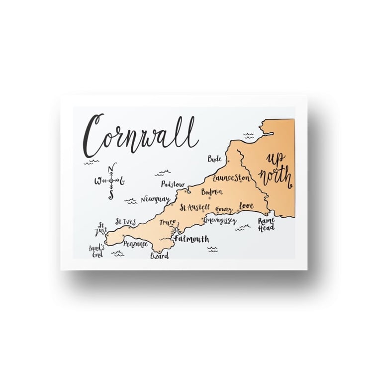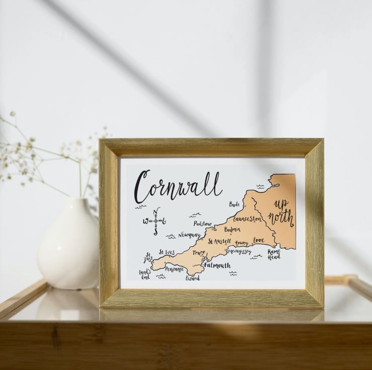A striking hand lettered illustration of a map of Cornwall, featuring hand lettered villages and town names.