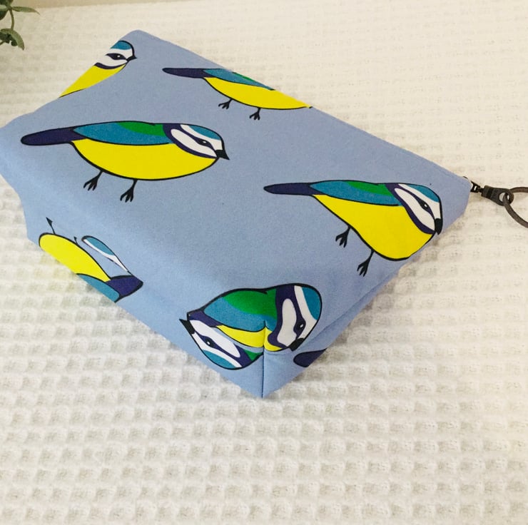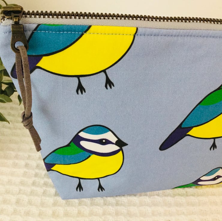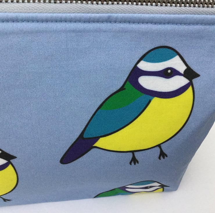 Hand made make up pouch or swim bag made from a delightful blue tit cotton fabric from Spoonflower and lined in a blue rip stop water resistant fabric. Size 9” wide x 6.5”