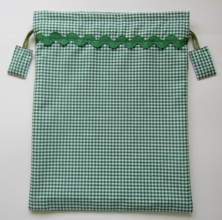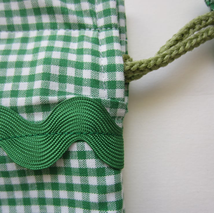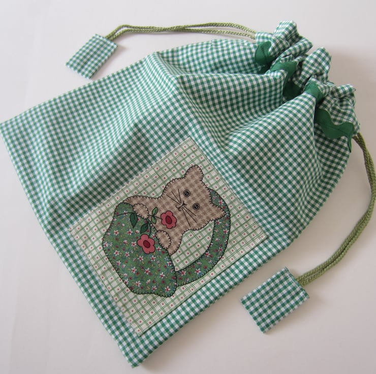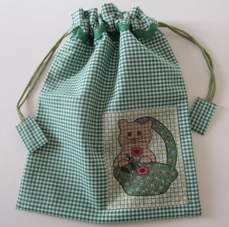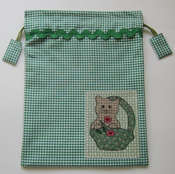 Drawstring bag in green and white checked gingham fabric with an added kitten in basket panel and green ric rac braid. It is lined with a strong showerproof lining. Pulls closed with matching cord and tabs.