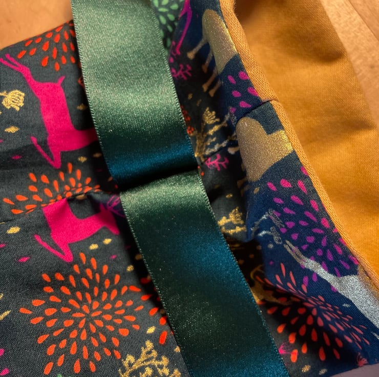 The deer pouch is made of a colourful Christmas cotton and matched with a slightly heavier gold-coloured lining.
