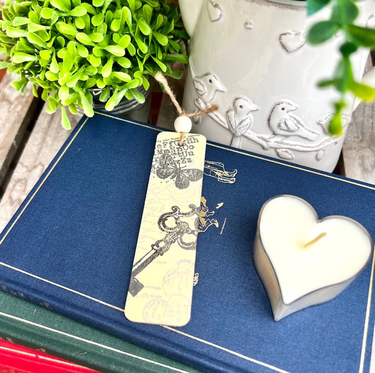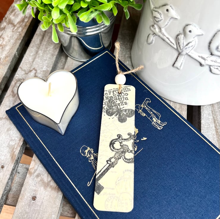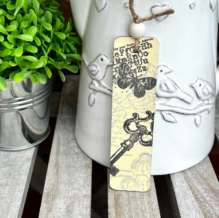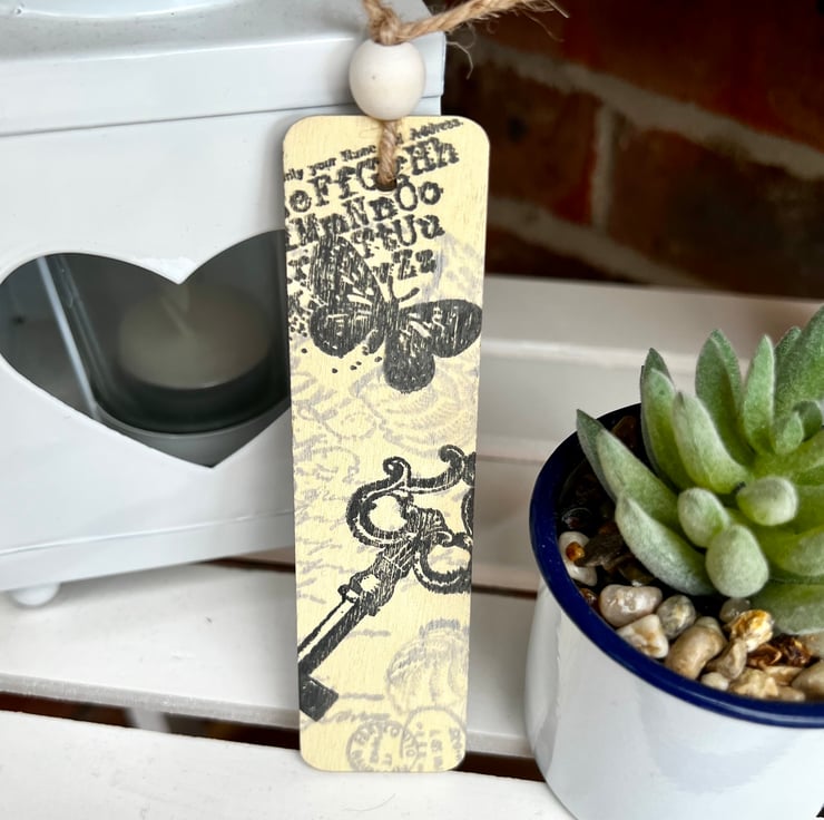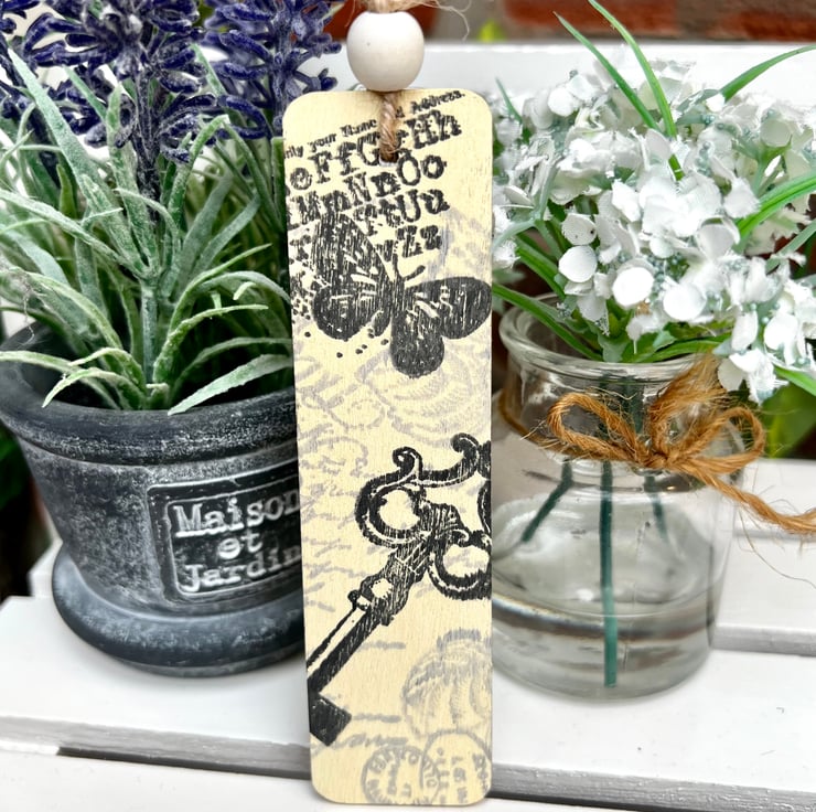 'Butterfly Key Wooden Bookmark' is a beautiful vintage style wooden bookmark. Approximately 12x3cm in size.
