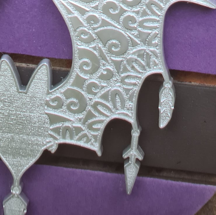 This item is approx 22cm H x 21cm W and is made of wood, painted in Black paint with Purple flocking to create the stripes. The decorative Bat is made of Resin.