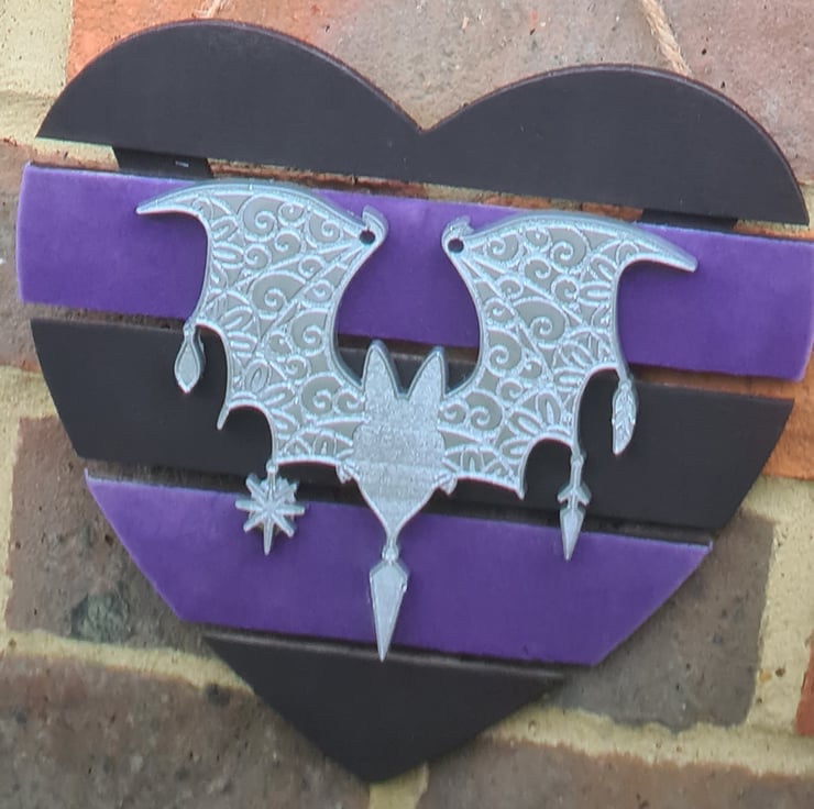 A gorgeous heart shaped plaque, painted Black and striped with Purple flocking. A beautiful Bat adorns the plaque in a fabulous Silver colour.
