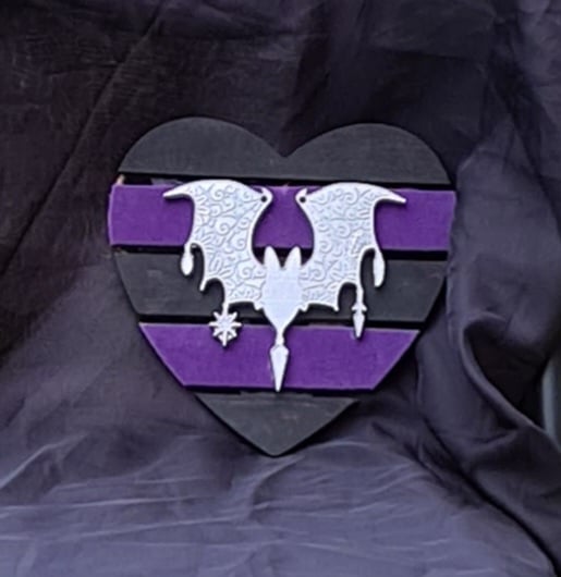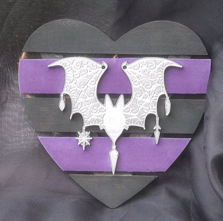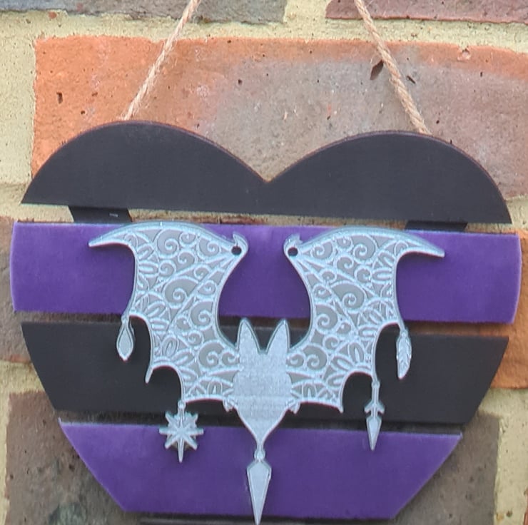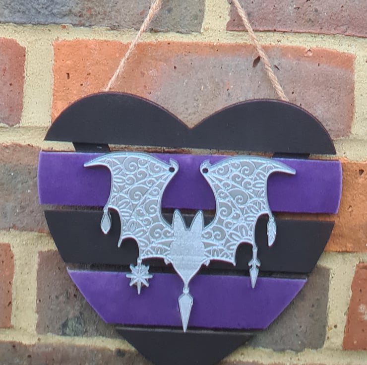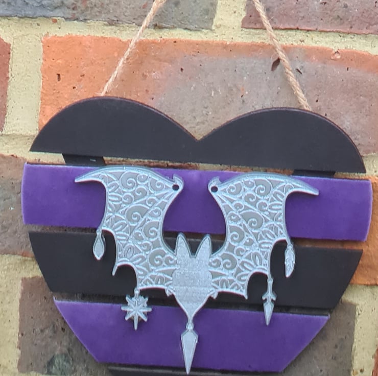 A gorgeous heart shaped plaque, painted Black and striped with Purple flocking. A beautiful Bat adorns the plaque in a fabulous Silver colour.