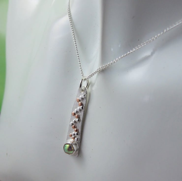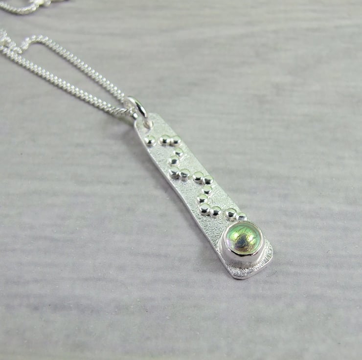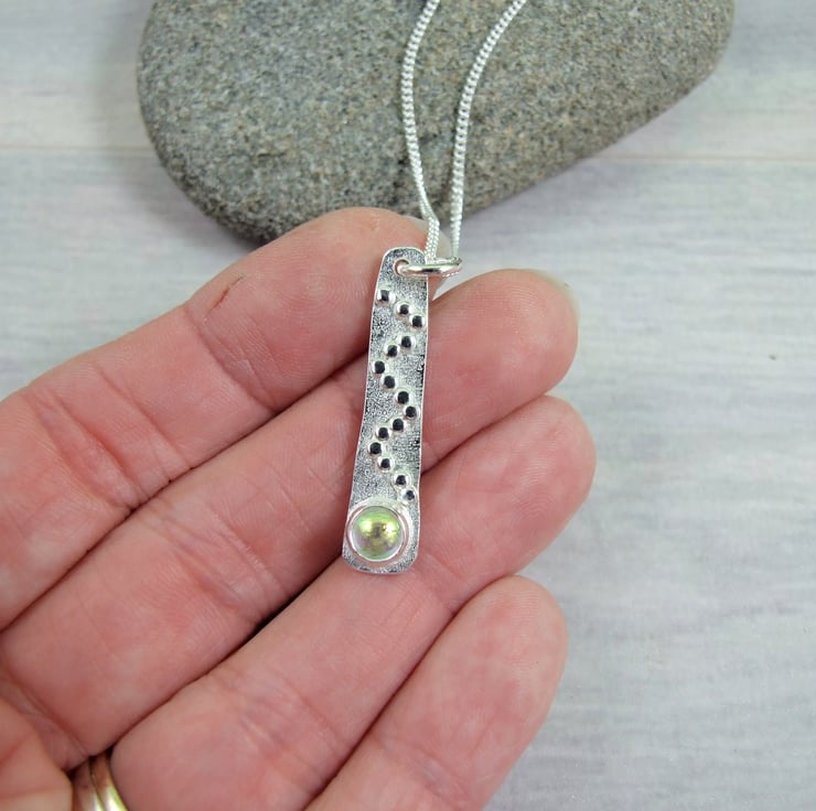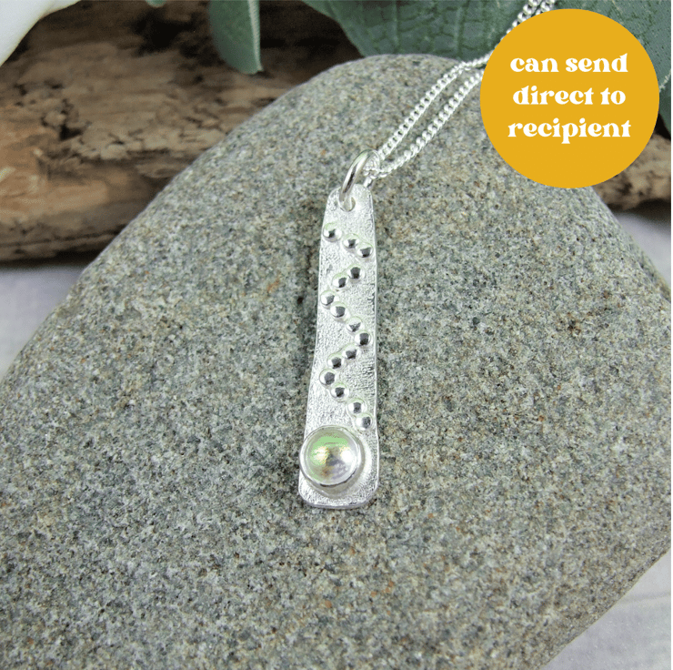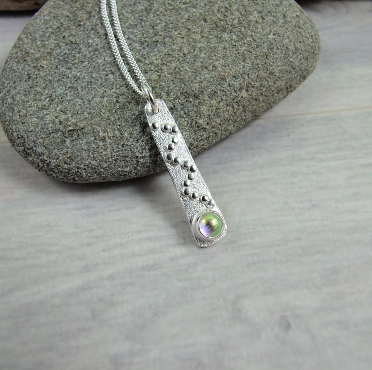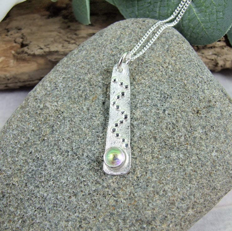 I have created the pendant from sterling silver wire forged to create a long tapered shape then added some texture with a diamond hand tool and soldered on a few tiny silver beads for decoration. At the bottom of the pendant I have added a silver setting which holds a 6mm dichroic glass cabachon. I have made the glass cabachon myself from specially coated glass, cut to size and kiln fired giving a wonderful shimmery effect. Fitted to an 18 inch sterling silver chain.