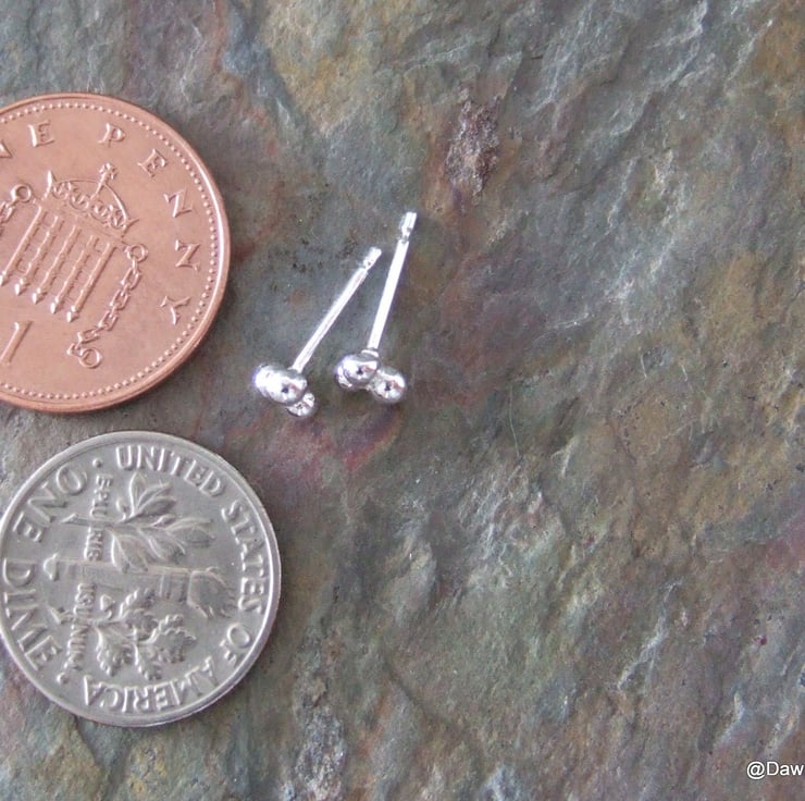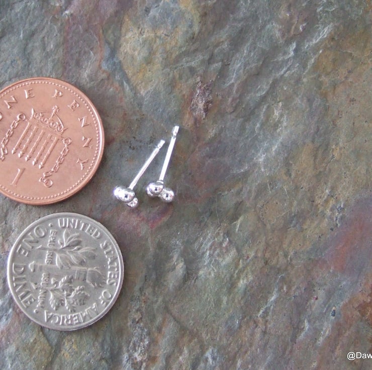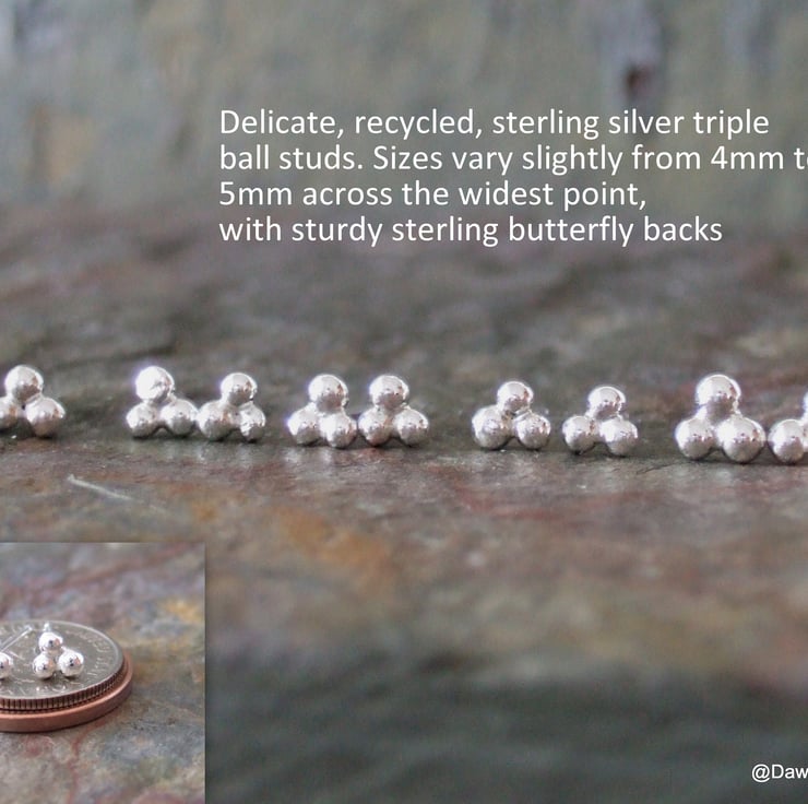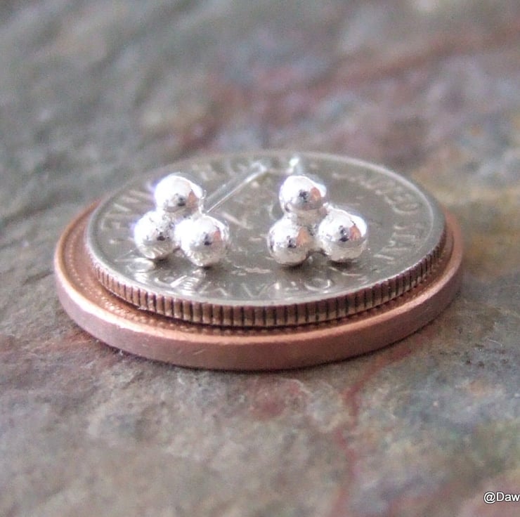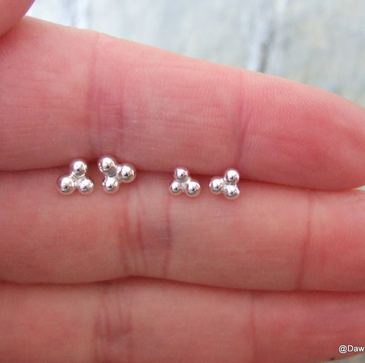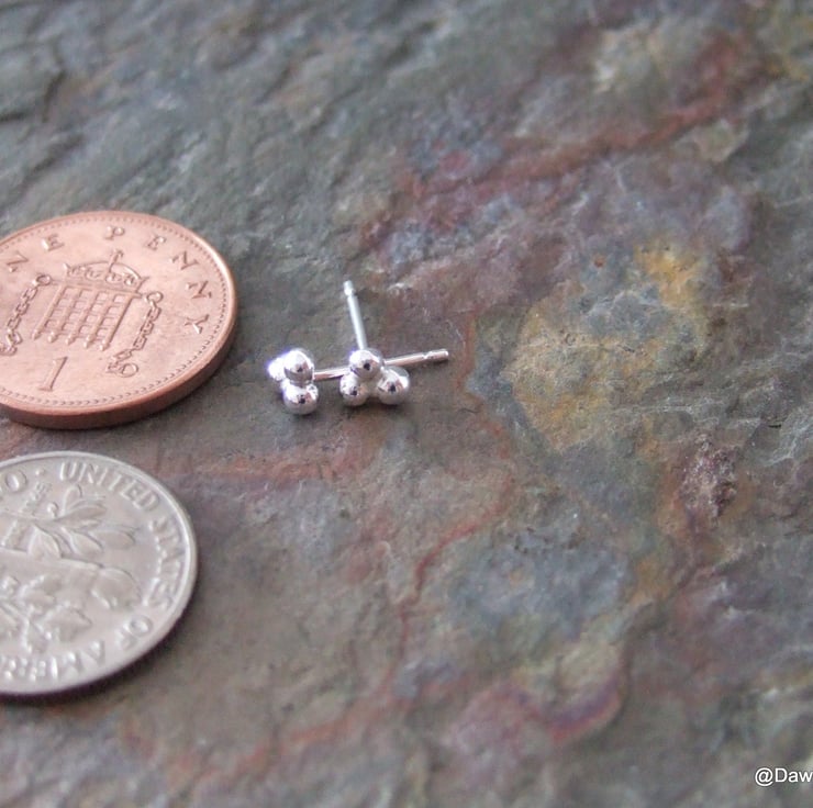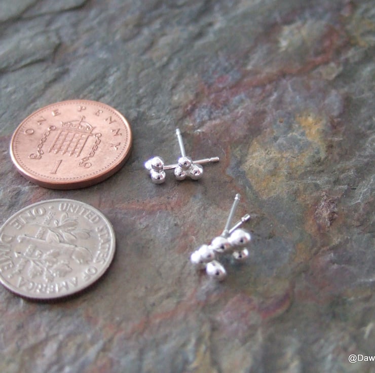 These are made from tiny silver balls, that I create by melting my scrap sterling and pure silver (all the little bits of wire and bits of sheet), and then group together, soldering them and the stud post simultaneously. This results in earrings that are all slightly different, measuring between 4 and 5 mm at the widest point.