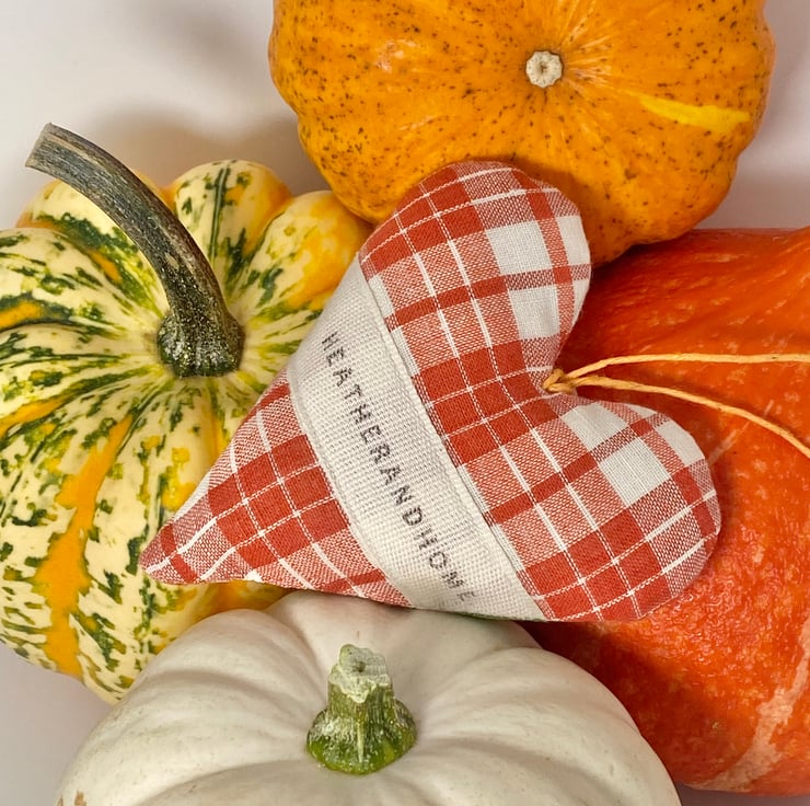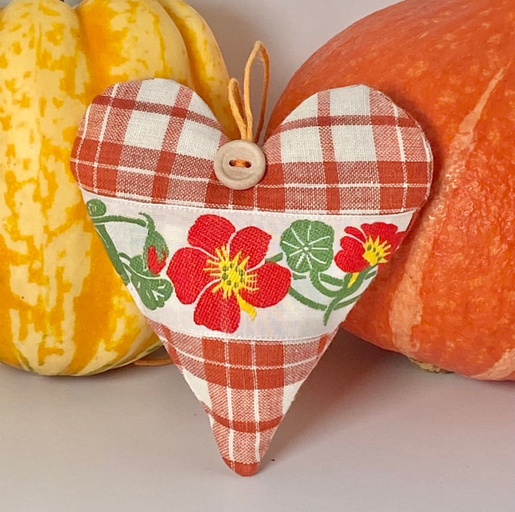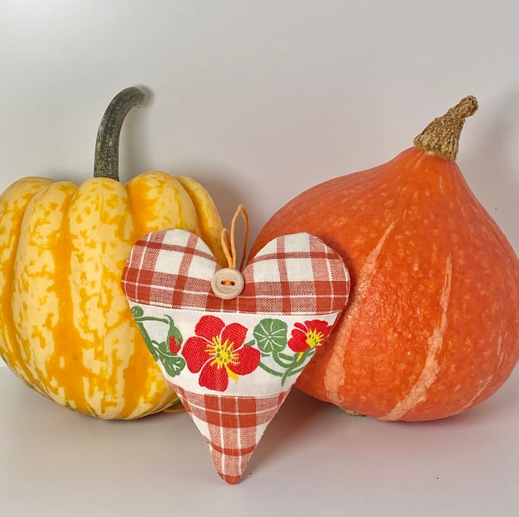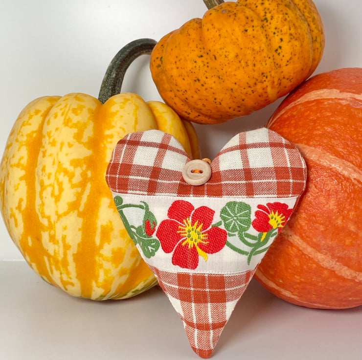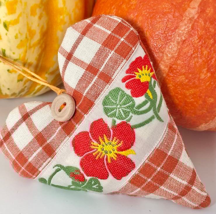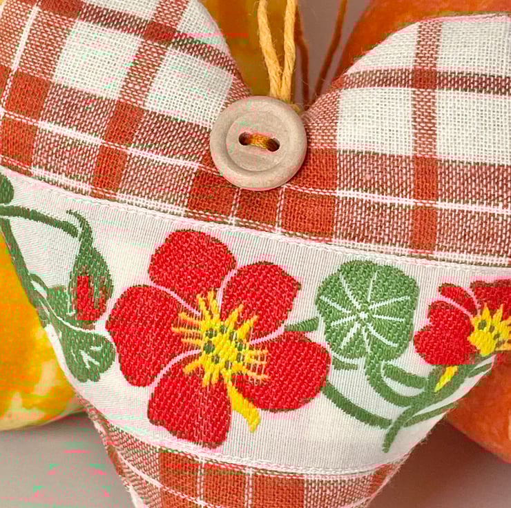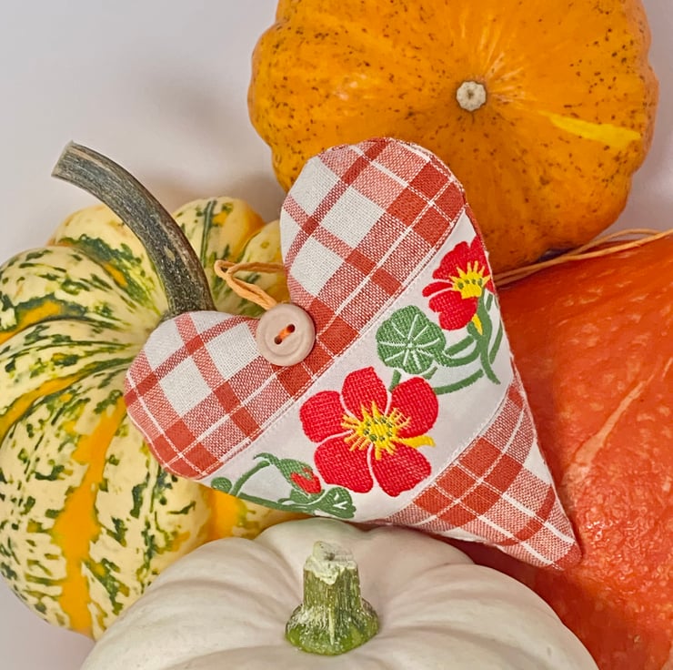 October's Heart of the Month pays homage to the beautiful colours of autumn, with a soft burnt-orange check fabric and a delightful woven ribbon adorned with cheerful nasturtium flowers.