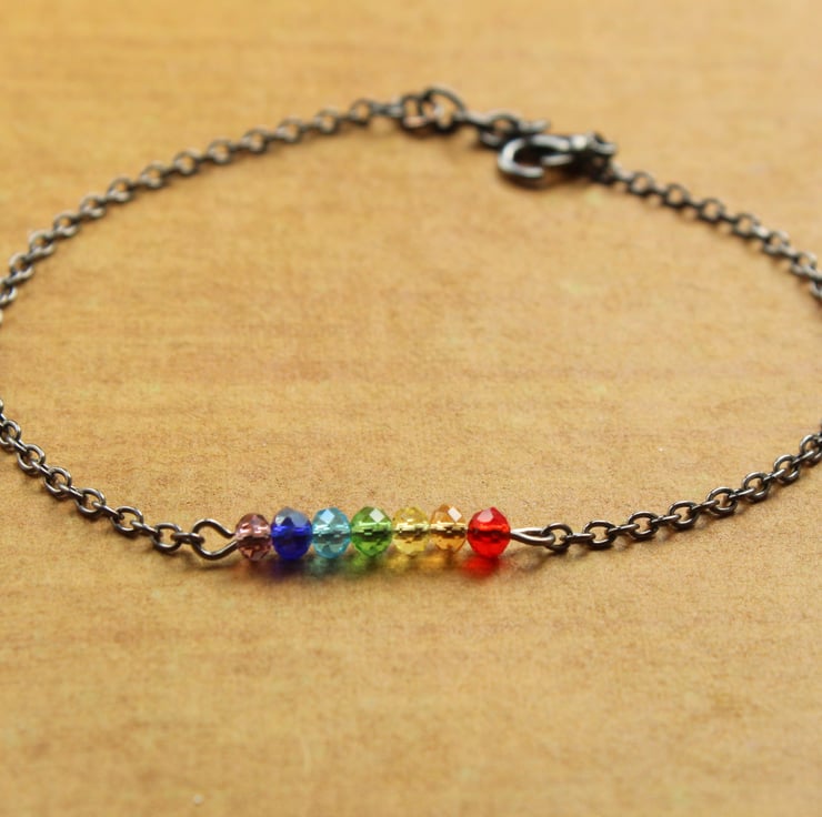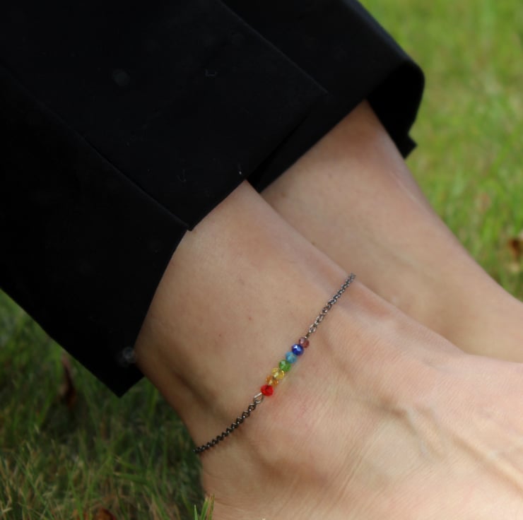 This listing is for a gunmetal / black chakra ankle bracelet with crystals used to represent each of the 7 chakras. Chakras are said to be the energy centres of the body. Using the seven colours of the spectrum, Colour Therapy aims to balance and enhance our body's energy centres/chakras and also to help stimulate our body's own healing process.