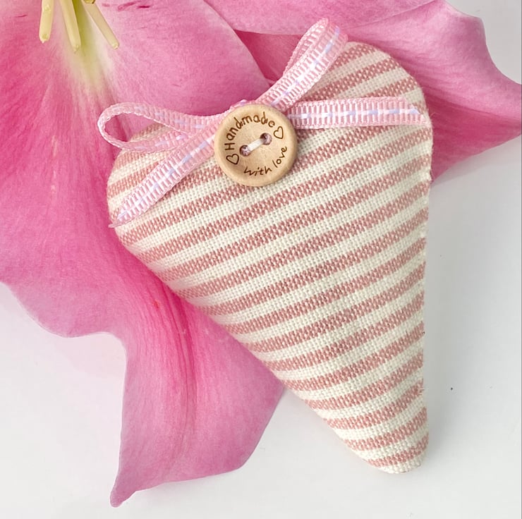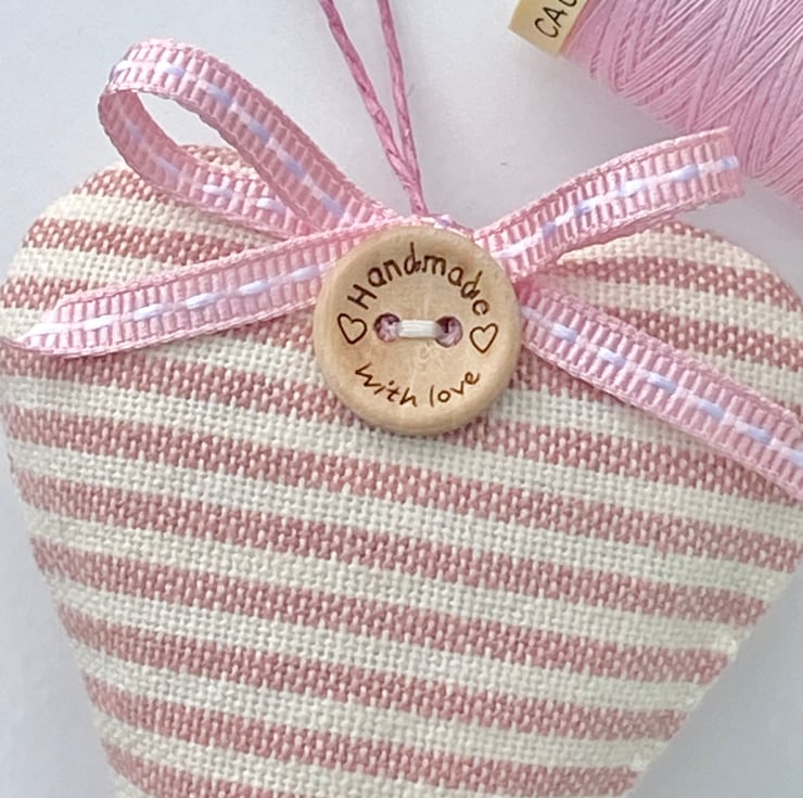 Filled with super fragrant Hampshire lavender or with hypoallergenic wool toy-stuffing, and finished with a round wooden button, pink hemp twine hanging ties and a pale pink stitched-detail ribbon bow.