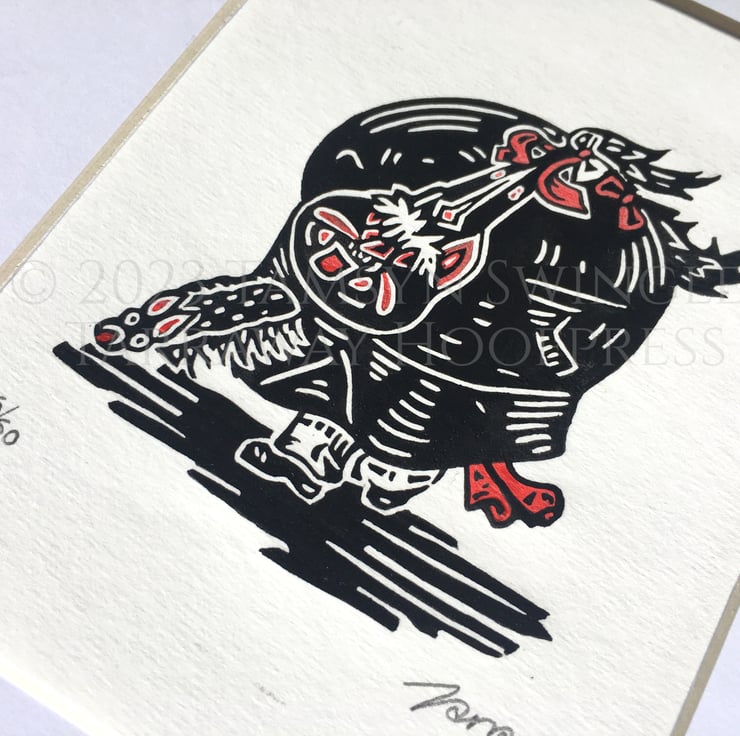 Water-based black, matte ink print on white 220gsm paper, hand-hand pressed with a spoon and touched up by hand also to give it a consistent tone all over, and hand coloured with acrylic ink.