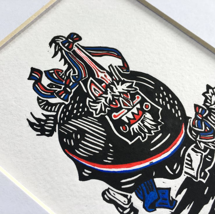 Water-based black, matte ink print on white 220gsm paper, hand-hand pressed with a spoon and touched up by hand also to give it a consistent tone all over, and hand coloured with acrylic ink.