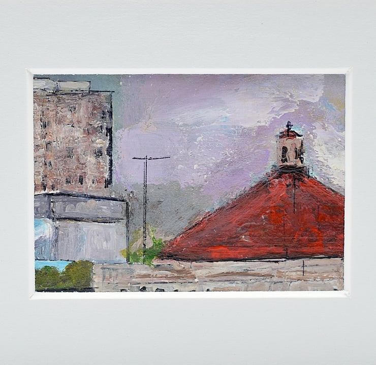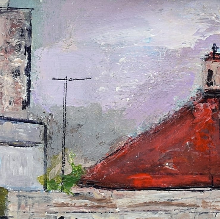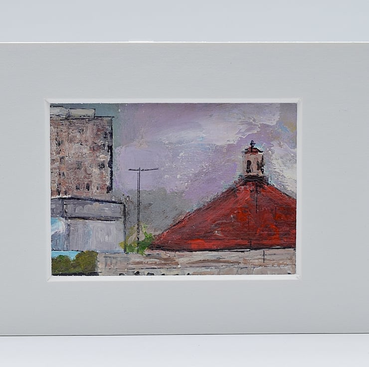 The red rooftop takes centre stage in this small artwork. The eye is drawn up to the top of the roof of the ballroom which balances with the tall flats behind. The red paint dominates the work and the rest of the scene is in more neutral colours.