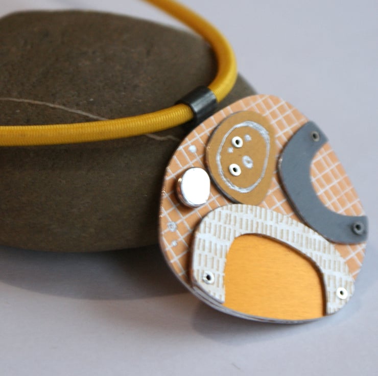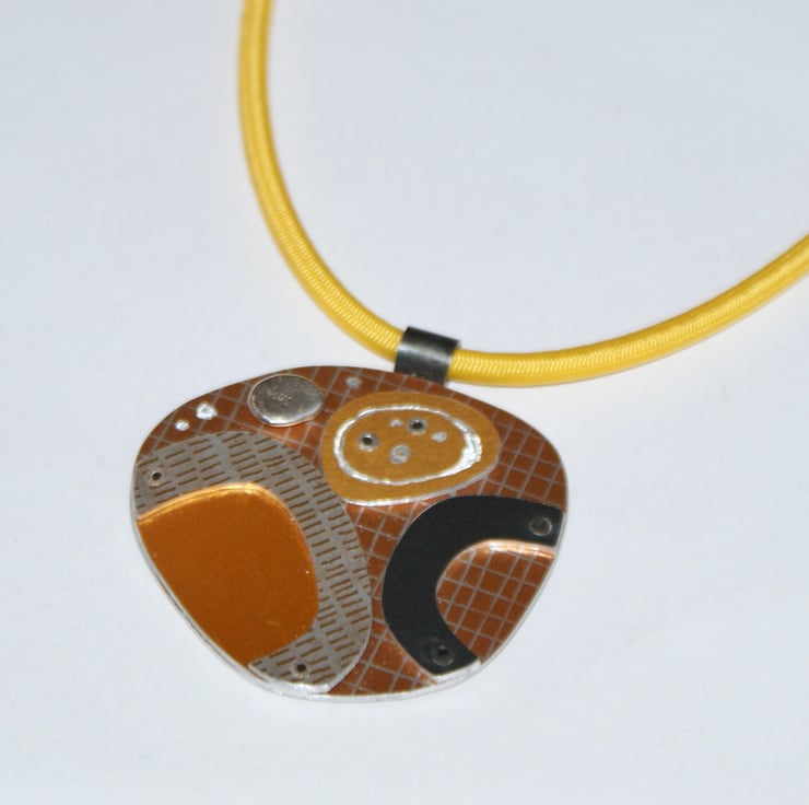 A one of kind necklace hand crafted from layers of anodised aluminium with silver detail. The coloured parts feature my own patterns and the pieces have been immersion dyed then cut and finished before being layers together and joined with silver rivets.