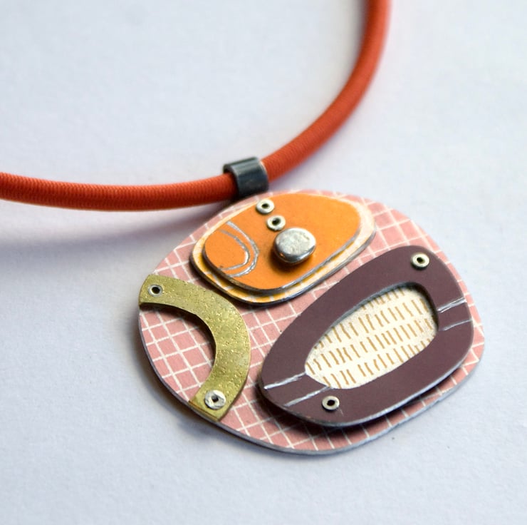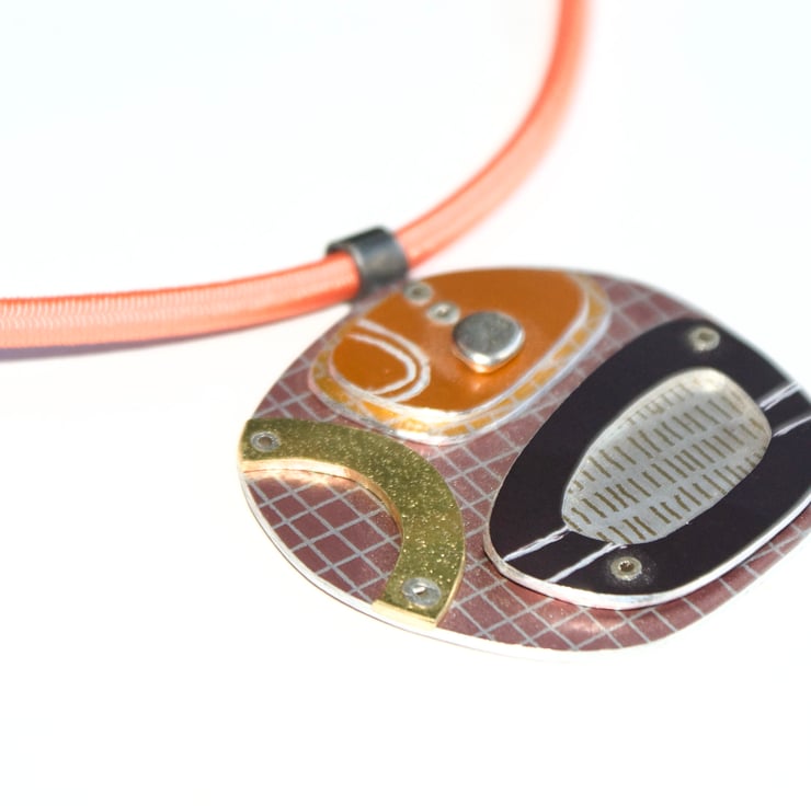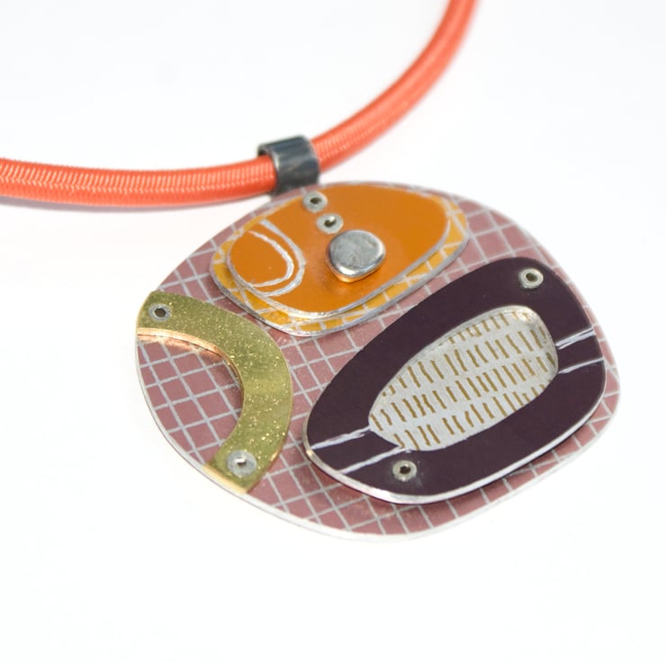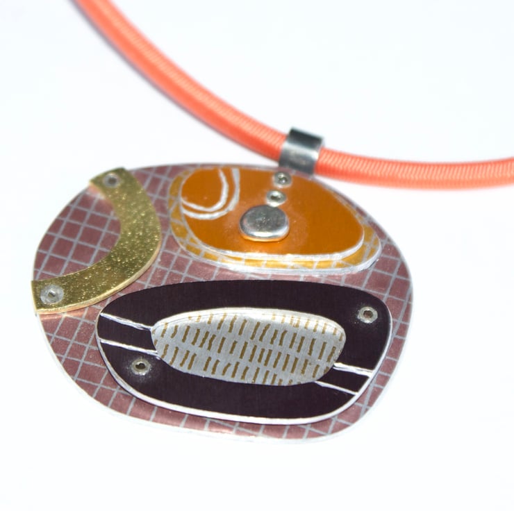 A one of kind necklace hand crafted from layers of anodised aluminium with silver and brass details. The coloured parts feature my own patterns and the pieces have been immersion dyed then cut and finished before being layers together and joined with silver rivets.