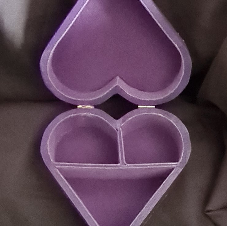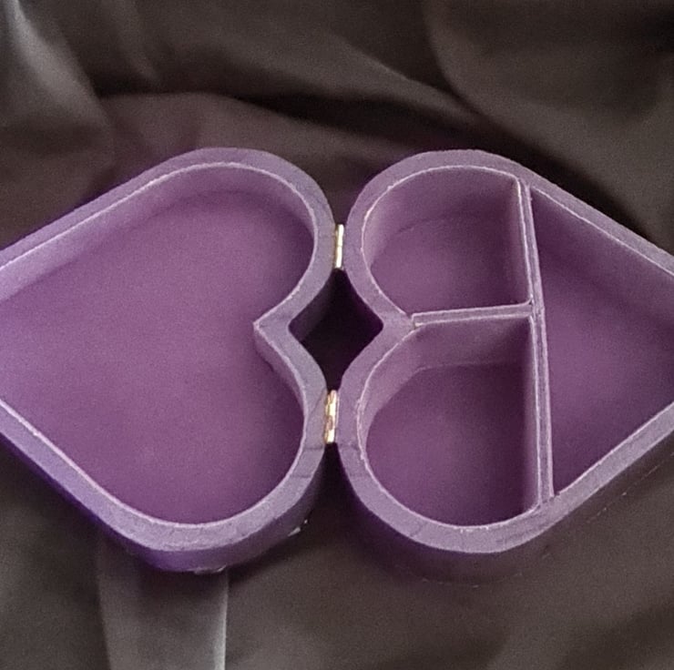 Box has 3 compartments for your items and hinges are at the top of the heart shape.