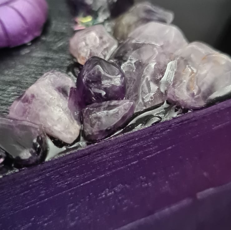 A lovely Heart shaped wooden box decorated in Black and Purple with a Purple Dragon and a fantastic scattering of Amethyst chips on the lid. Lined with Purple Flocking on the inside and on the bottom of the base this is an ideal gift to store your Dragons hoard.