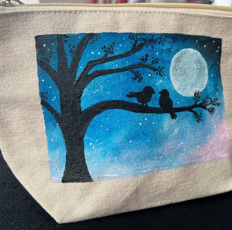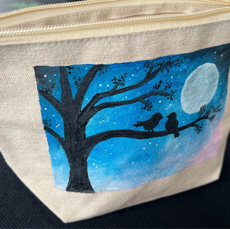 This item has been hand-painted by myself onto a brand new canvas purse or a small makeup/travel bag.