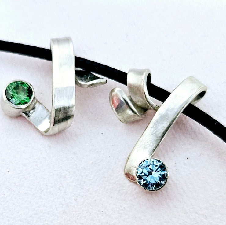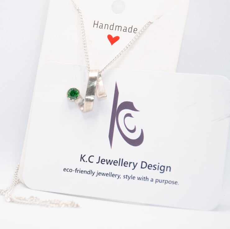 Handmade Eco sterling silver twist pendant, 5mm Green cubic zirconia. 18" Eco sterling Silver chain.