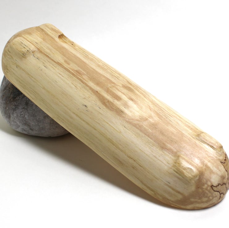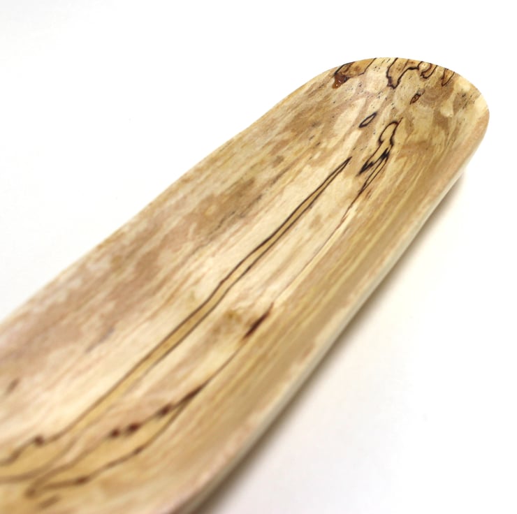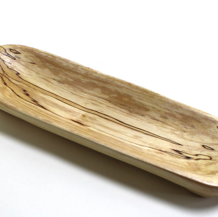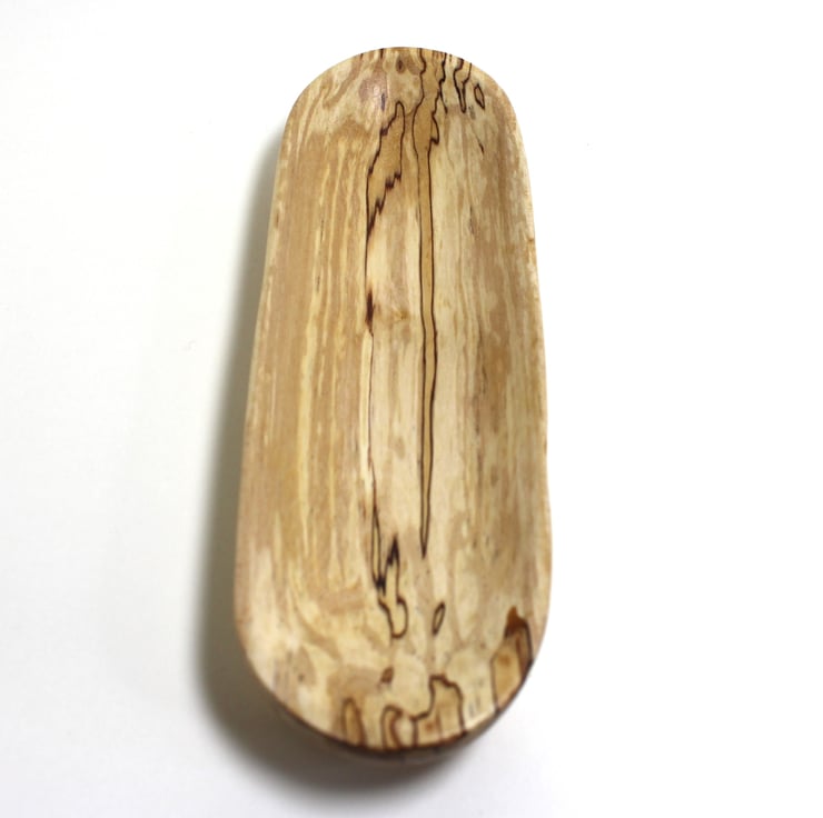 It can be somewhere to put pencils, pins and other round things that could otherwise roll away. Perhaps you want a fancy spoon rest. This piece of sycamore comes from a tree that was cut down in a little village in West Lancashire. It was intentionally exposed to the conditions and fungus that causes spalting to form. Then left for the perfect amount of time to create distinct marks in the grain, without compromising the strength of the wood.Then, the long process of storing and drying it. I could then eventually, patiently carve and sand it over a few days to form this lovely little footed dish with a beautiful and unique spalting pattern. Scyamore, being such a pale wood, is wonderful when spalted. It's a stunning contrast with incredible natural patterns that can never be repeated.