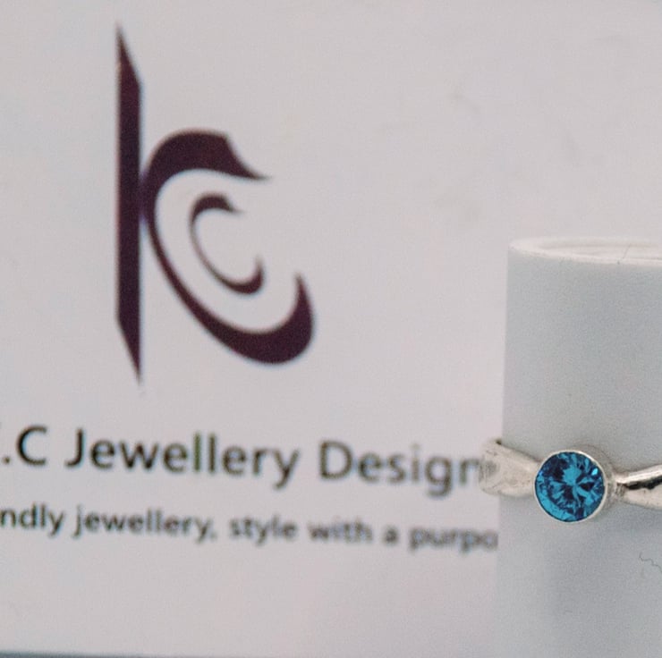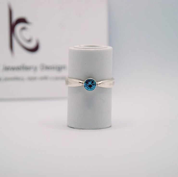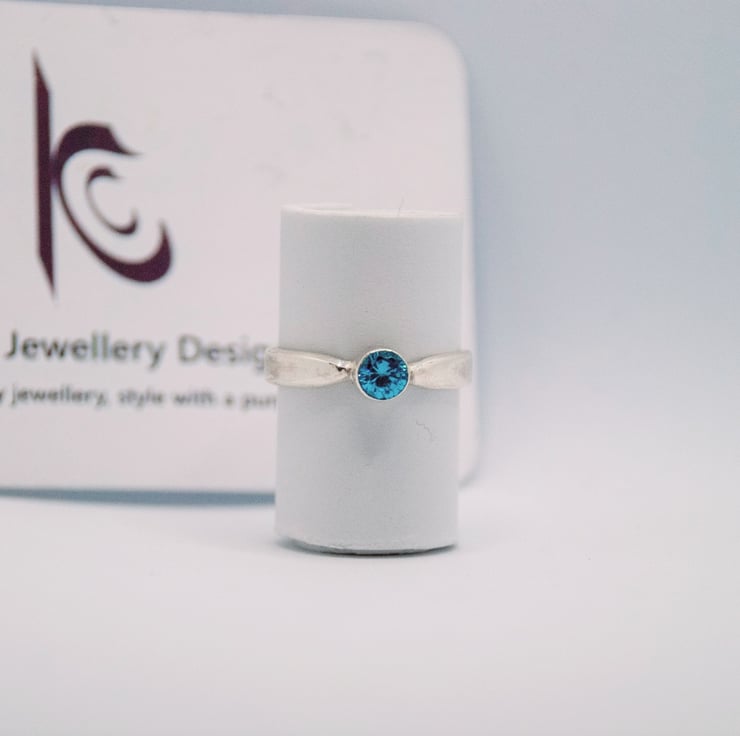 Handmade Eco sterling silver ring. 5mm Aqua blue cubic zirconia.