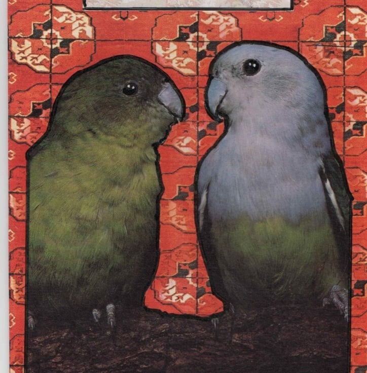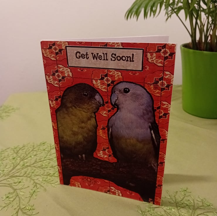 Green and blue love birds on a terra cotta patterned backing. Greeting reads "Get Well Soon" Card has a blank white inner lining.