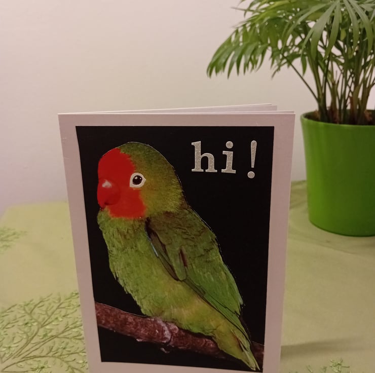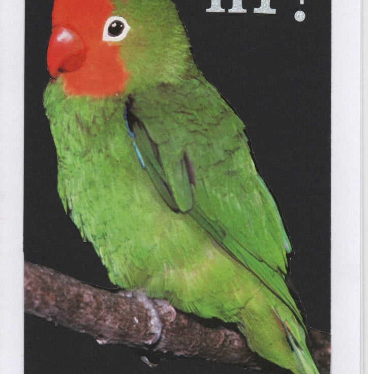 Green love bird on a black background. Silver lettering reads "hi!". The card has a blank white inner lining.