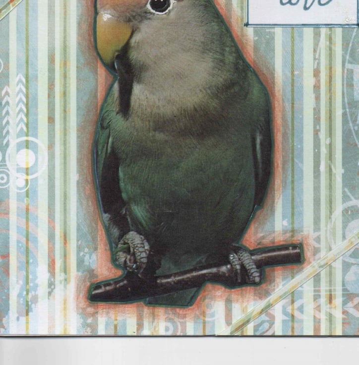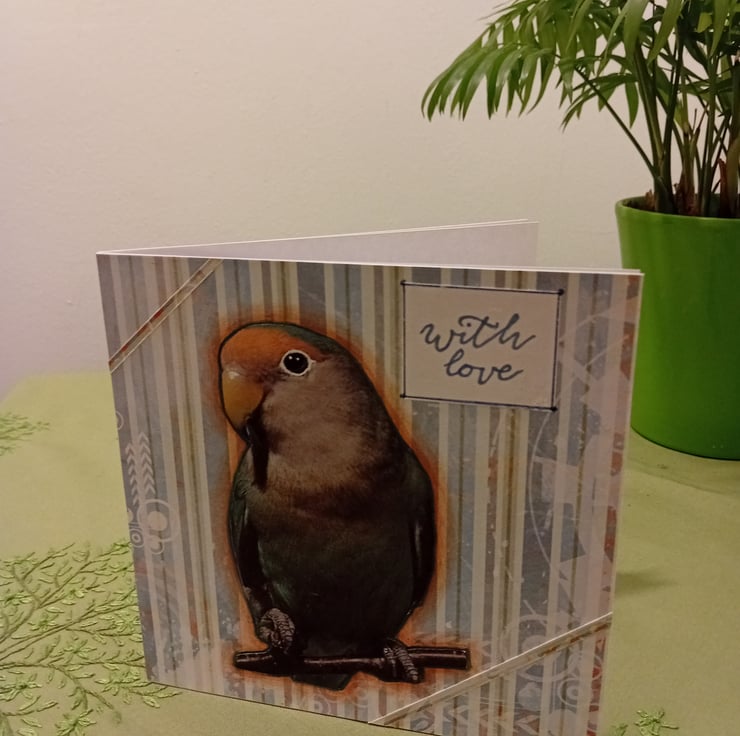 Ove bird A green-grey love bird with a peach coloured head, on a subtly patterned green-grey background with a peach coloured hilight. The greeting reads " With love".The card has a blank white inner lining.