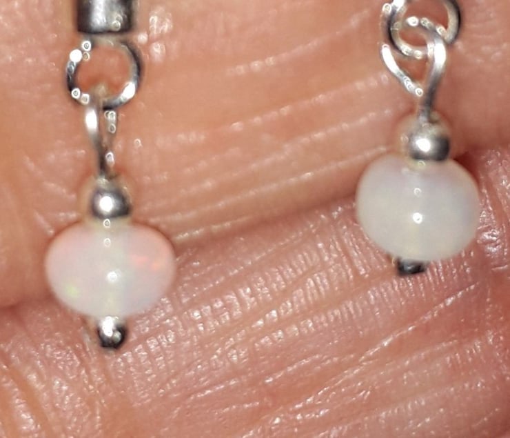 The opal gemstone beads are just over 4 mm wide and hang freely on the sterling silver bar stud earrings.
